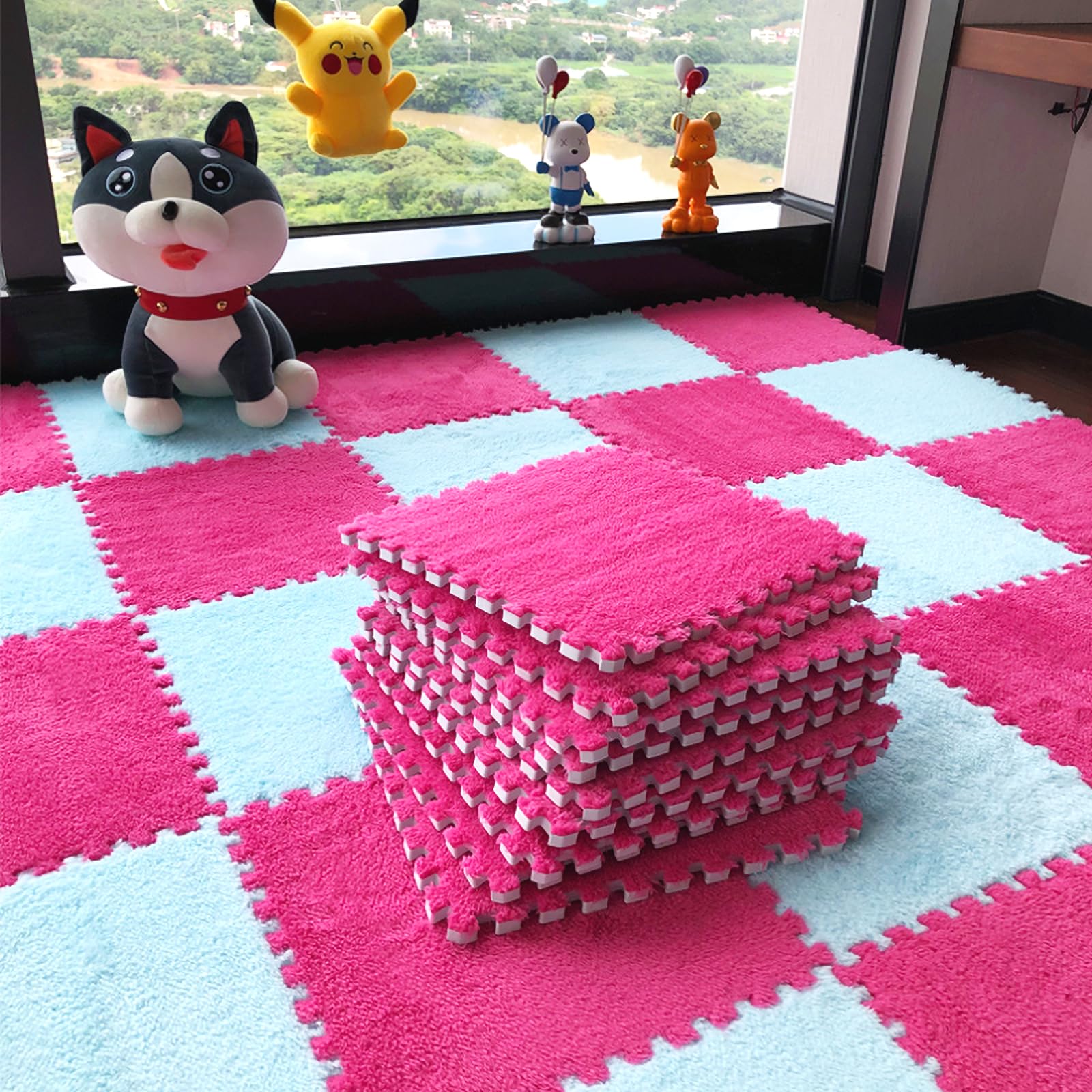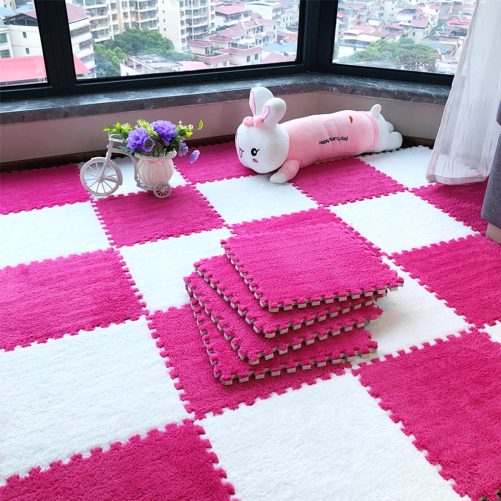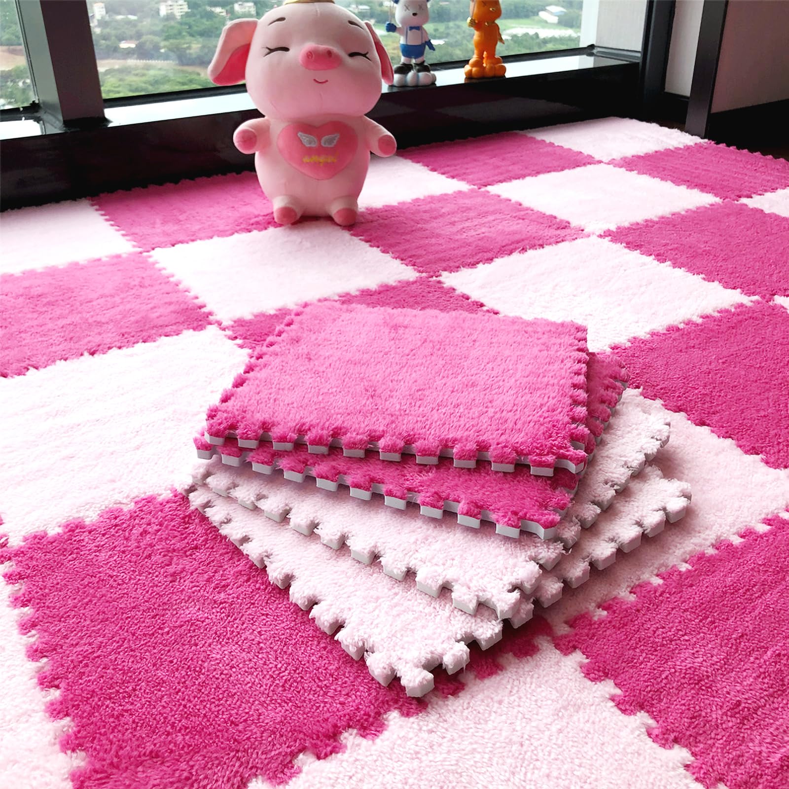 easycustomerlee 12pcs Interlocking Carpet Shaggy Soft EVA Foam Mats Fluffy Rugs Protective Floor Tiles Play Mats for Children Kids Room Home Parlor Bedroom(Rose)