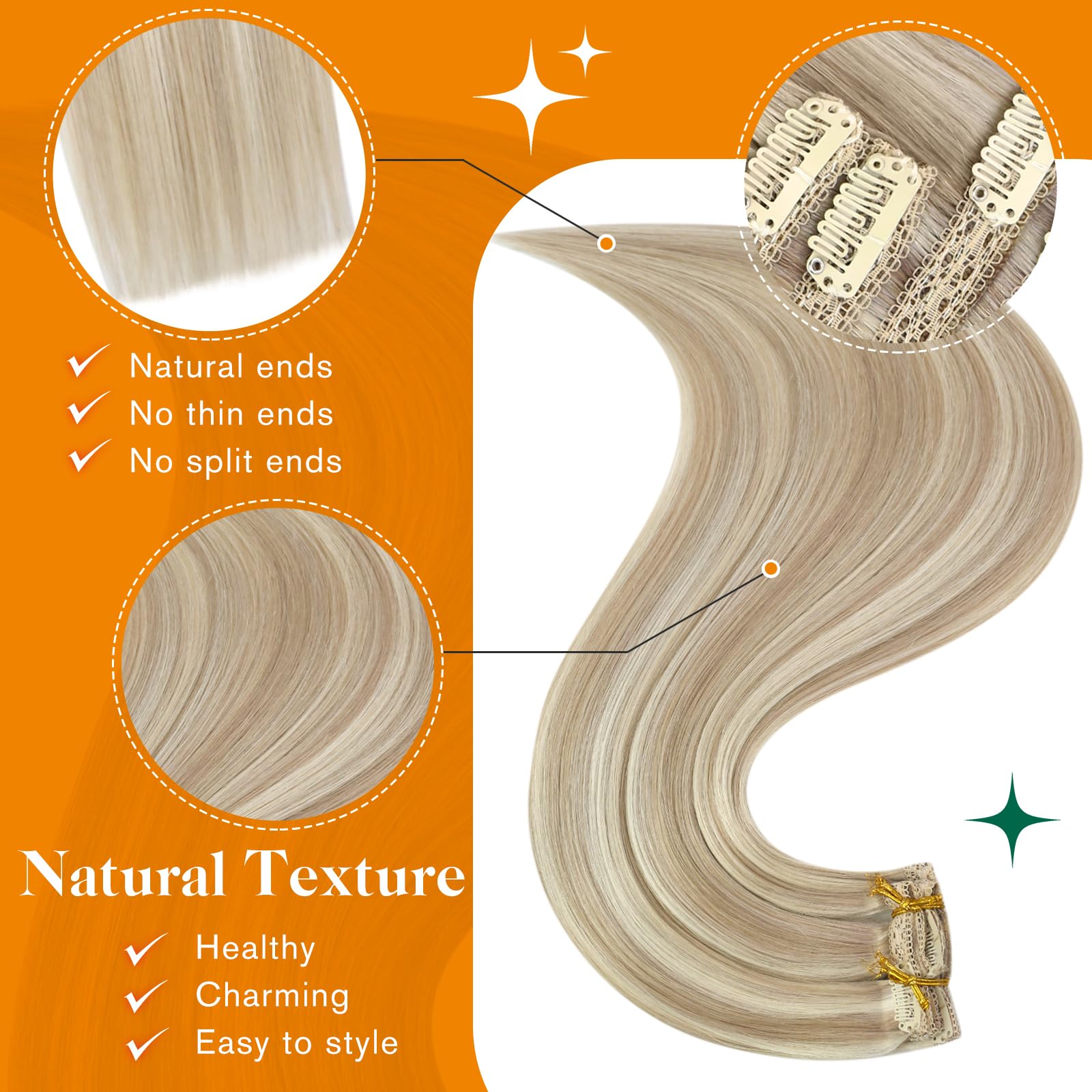 Easyouth Clip in Hair Extensions Real Human Hair Highlight Clip in Hair Extensions Ash Blonde Highlights Bleach Blonde Hair Extensions Clip ins Double Weft 12 Inch 70g 5pcs