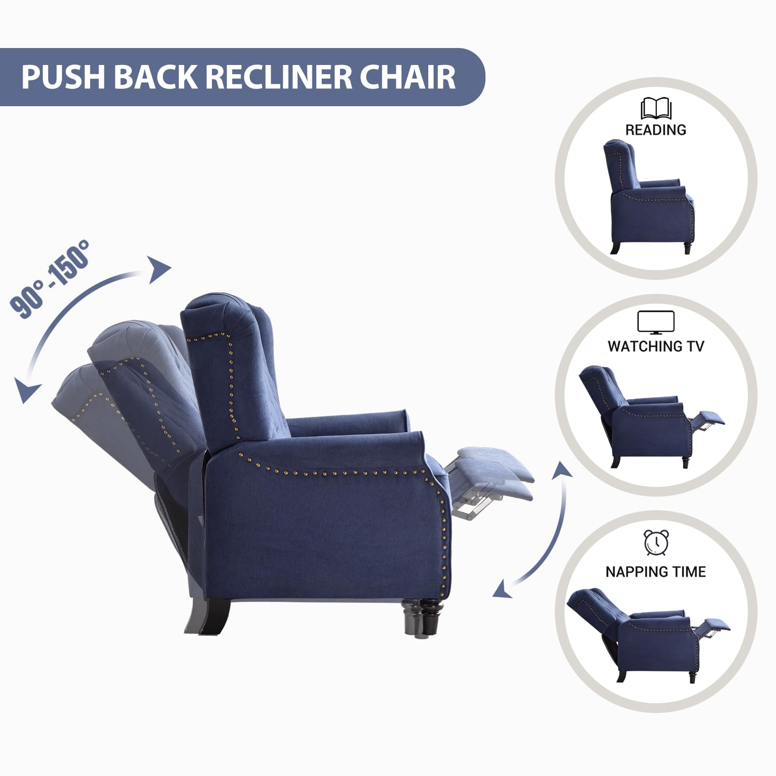 - Modern Design: With a Button-tufted Diamond Design the pushback recliner chair will brighten your living decor. And blue recliner is ideal for most kinds of the decor style. Perfect for living rooms, bedrooms, theater rooms and media rooms