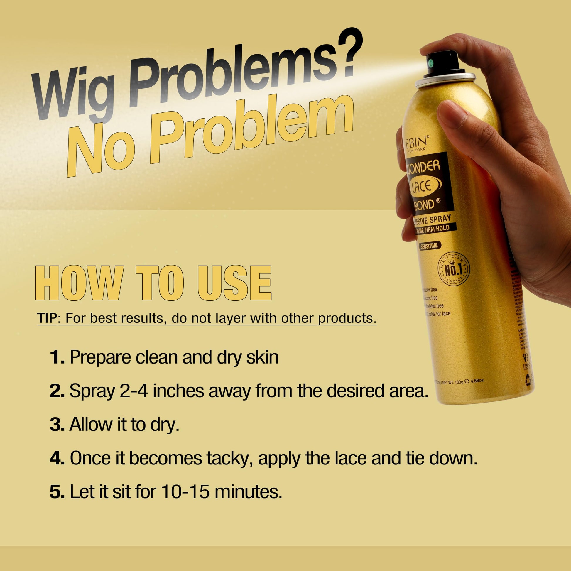- [ADHESIVE SPRAY] Elevate your wig game with the EBIN NEW YORK Wonder Lace Bond Adhesive Spray, the ultimate melting spray designed to secure your wig flawlessly. This advanced formula seamlessly blends into your hairline, providing a natural look that enhances your wig's appearance. Perfect for lace front wigs, toupees, and hairpieces, this adhesive spray ensures a secure and flawless finish every time.