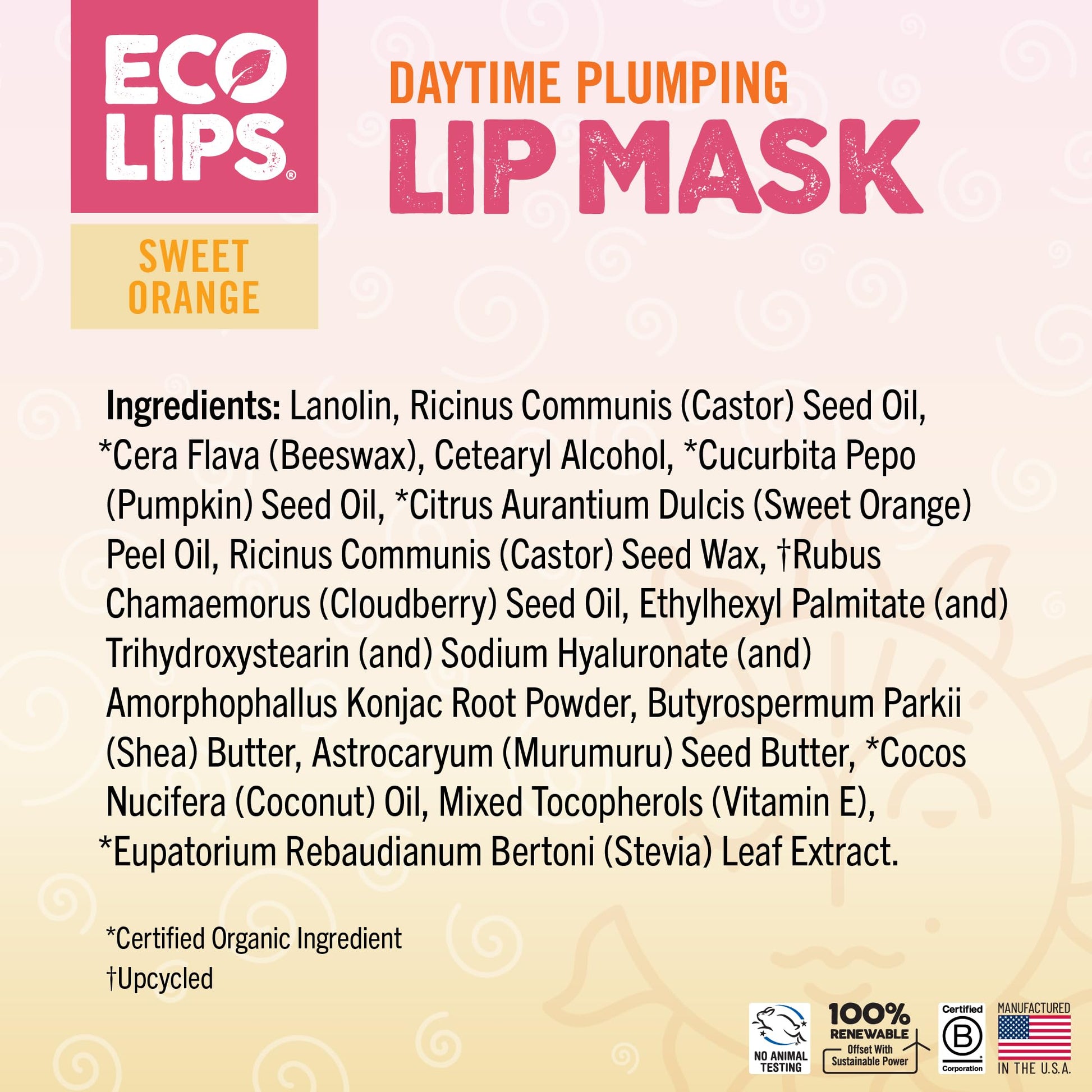 Details: Start your lip care routine off with our Organic Vanilla Bean Lip Scrub to gently exfoliate and polish lips. Apply in a circular motion to remove dead skin and moisturize lips – preparing them for the next step! Next, apply Eco Lips Daytime Plumping Lip Mask. It features a nourishing blend of upcycled cloudberry oil with organic pumpkin seed oil to keep lips conditioned and soft all day long. Harness the power of hyaluronic acid to add moisture and keep lips supple and plump. With its uplifting sweet orange flavor, this daytime lip mask is packed with upcycled cloudberry seed oil (loaded with vitamin C) to keep your lips smiling day in and day out.