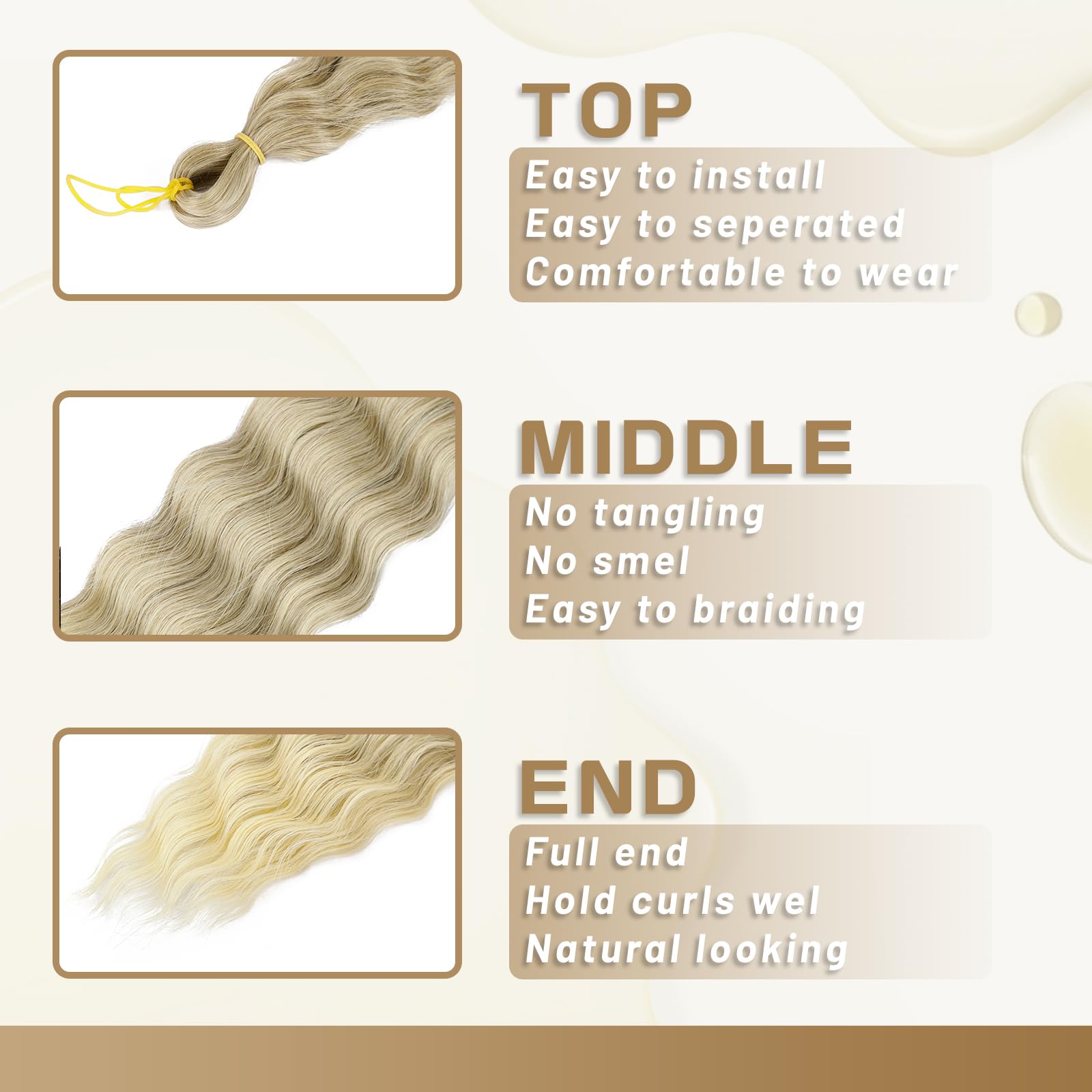 - High-Quality Material: Our ocean wave crochet hair is made from premium synthetic fiber, to resemble the touch and feel of human hair, skin friendly, comfortable to wear, natural looking, prefect protective curly crochet hair style, offering a stunning appearance that will make you stand out from the crowd.