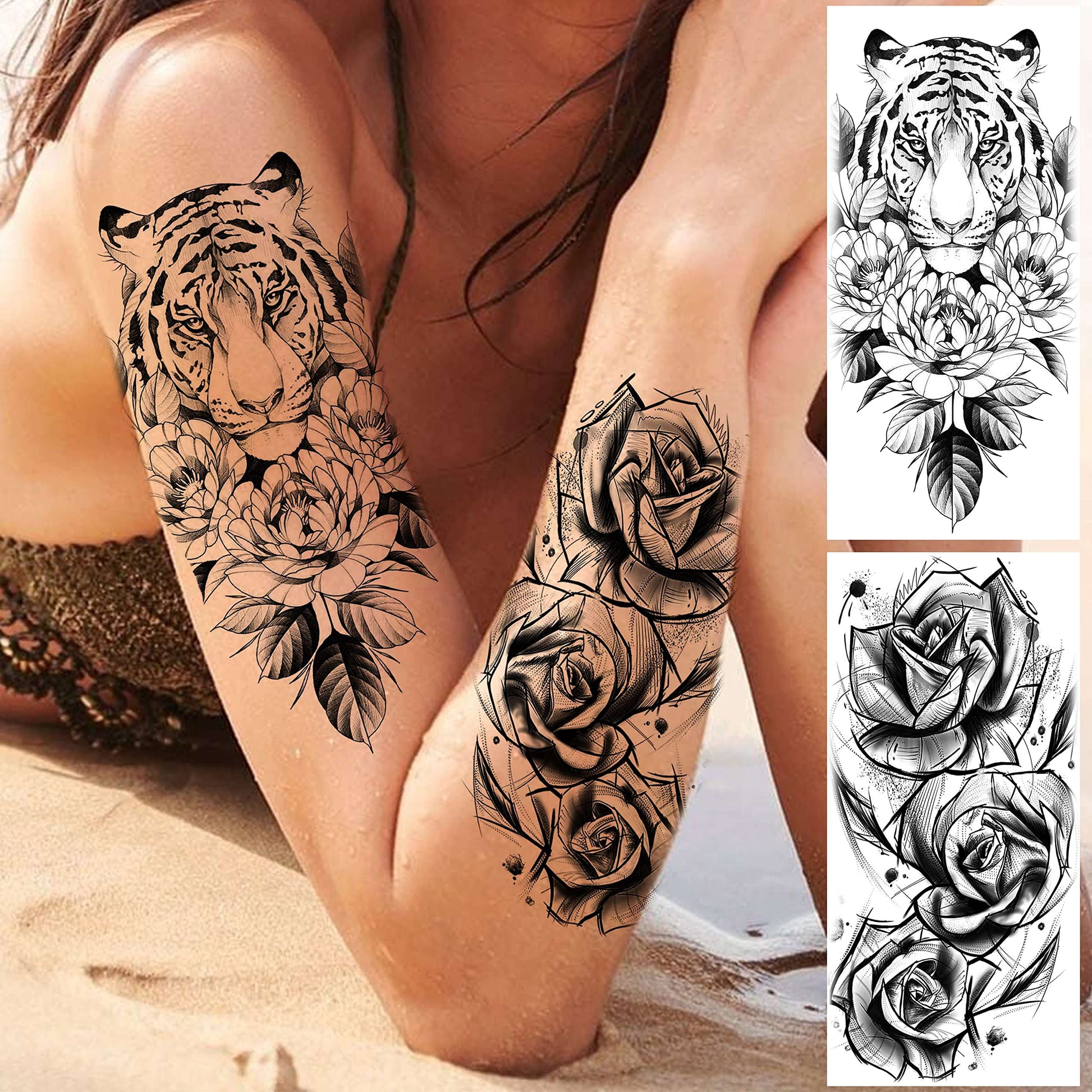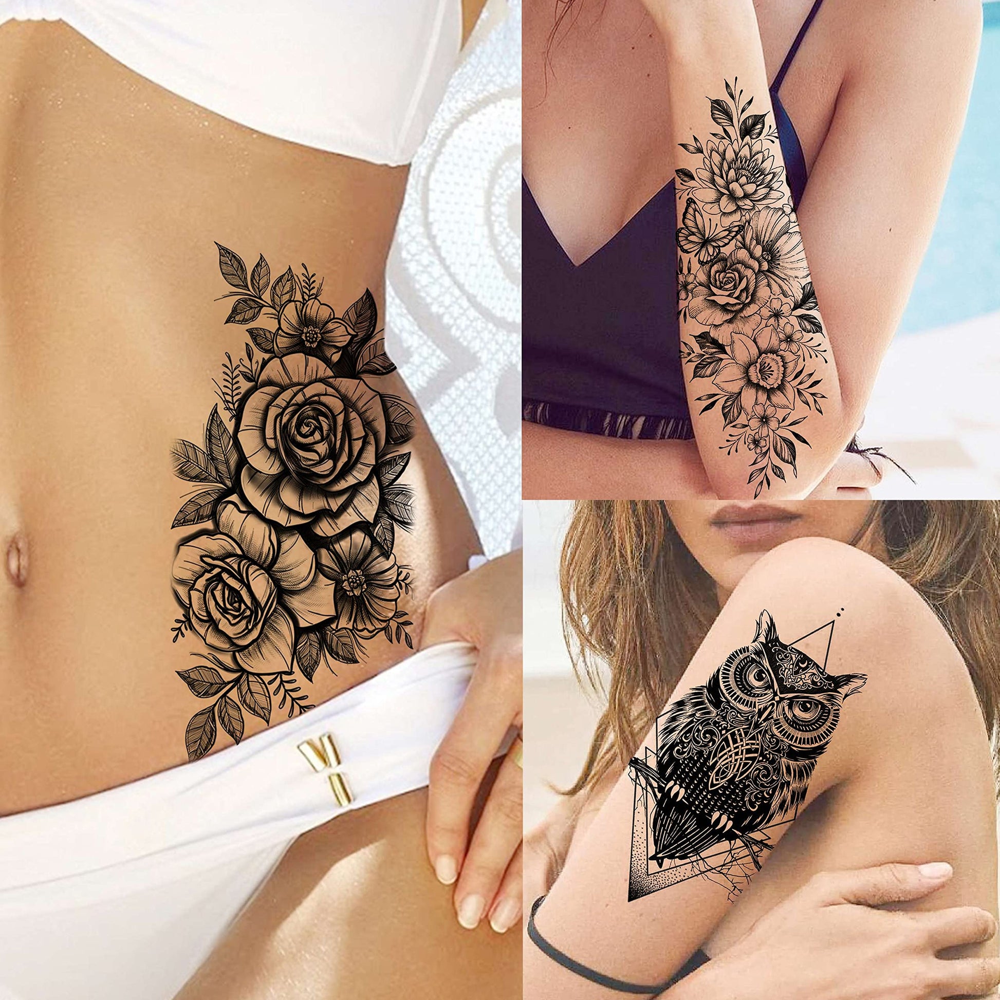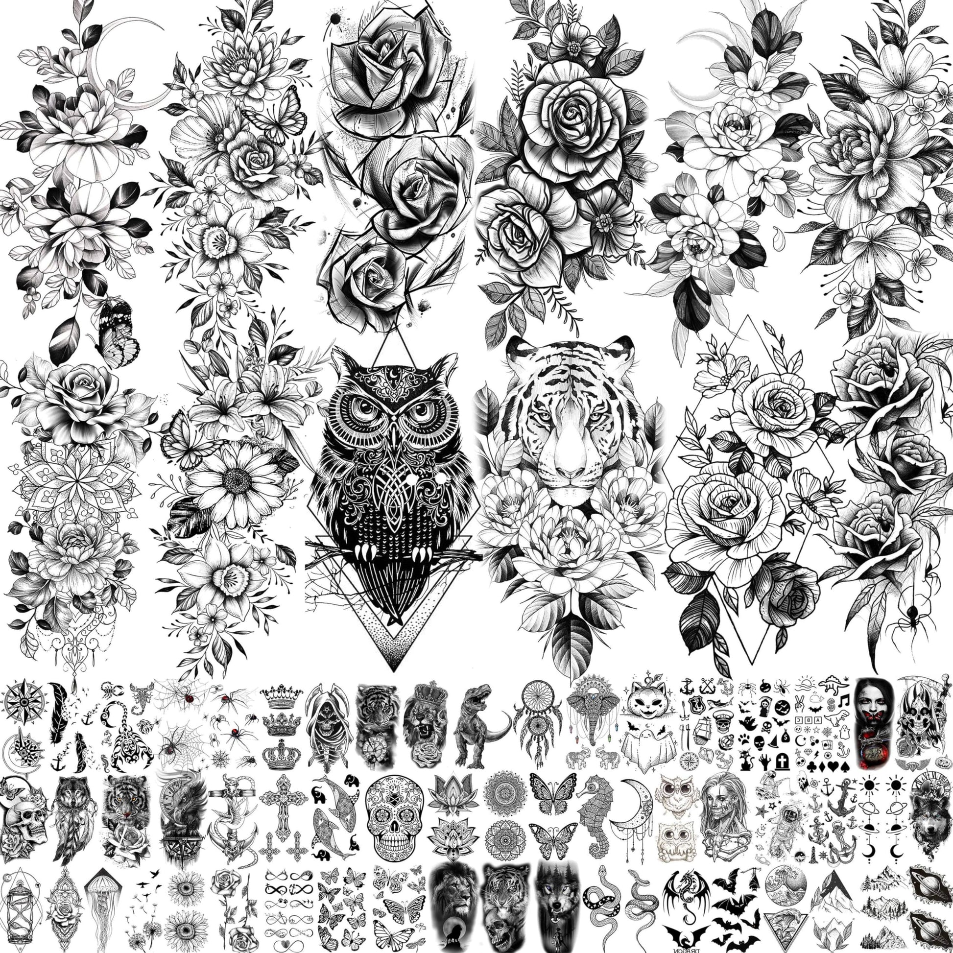 EGMBGM 69 Sheets Realistic Peony Rose Flower Temporary Tattoos For Women Girls Arm Thigh, Owl Tiger Floral Waterproof Long Lasting Temp Fake Tattoos For Women, Small Black Tattoo Stickers Kids Finger