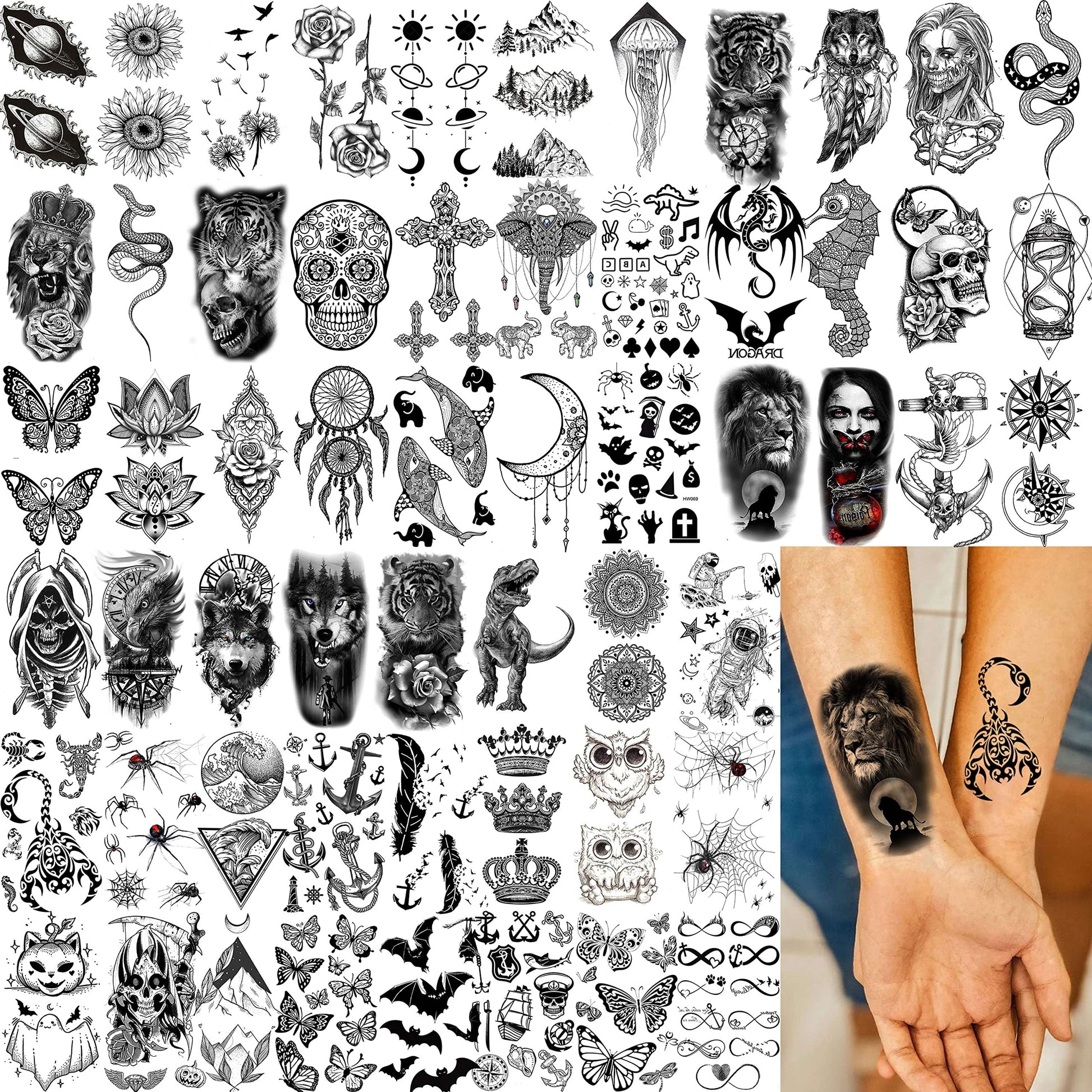 - 🍷69 Sheets Flower Temporary Tattoos Sticker Fashion Designs🍸 EGMBGM Brand Original Owl Rose Flower Peony Floral Tiger Moon Feather Birds Scorpion Spider Spiderweb Crown Elephant Dreamcatcher Dinosaur Skull Skeleton Halloween Bat Space Univese Gangster Dolphin Mountain Temporary Tattoos For Women Girls. There Are 12 Sheets 19x9CM 7.4'x3.5' Large Arm Sleeve Temporary Tattoos For Adults and 57 Sheets 10.5x6CM 4.1'x2.3' Fun Cute Tiny Small Temporary Tattoos For Kids Girls Boys In Each Package.