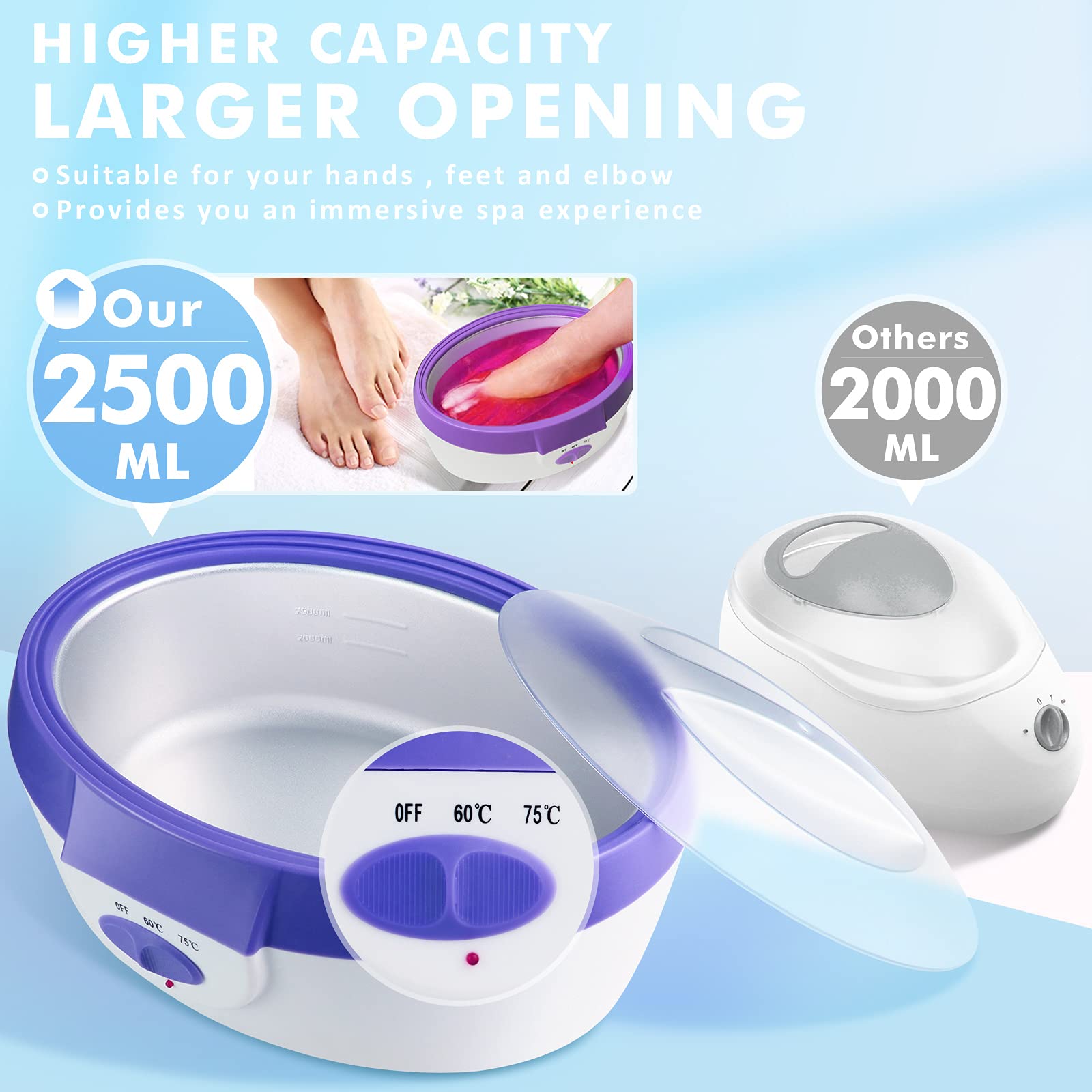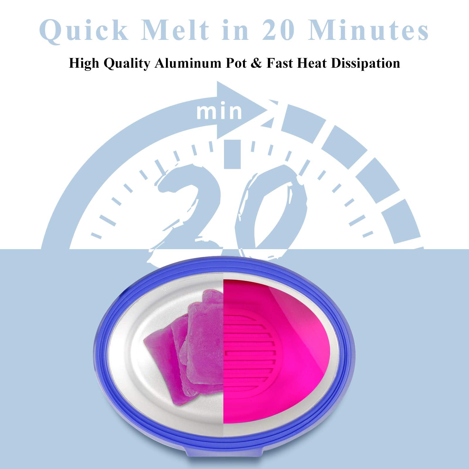 - Quick Heat in 20 mins & Large Capacity: Ejiubas Paraffin Wax Machine is constructed of aluminum inner pot and offers a suitable range of temperatures from 140 ℉ to 170 ℉which makes wax melt quickly and evenly; Take only 20 minutes to melt 2 lbs wax while others take as long as 2h. With the large opening(10.63*7.5*3.74 inch), you can easily to dip hand ,feet and elbow.