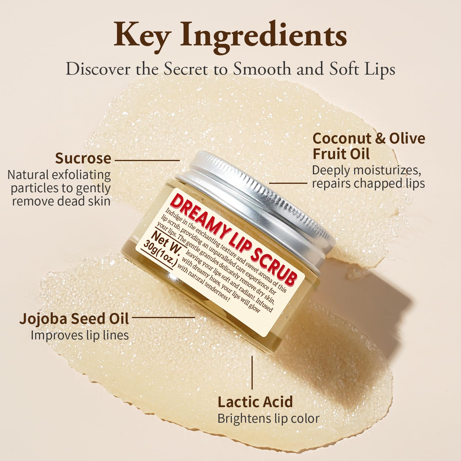 - Natural Exfoliating Particles: Our lip scrub utilizes ultra-fine sugar granules to gently exfoliate dead skin cells from the lips. These tiny particles delicately remove dead skin cells from the lips, leaving them feeling soft, smooth, and free from dryness, welcoming a silky texture;