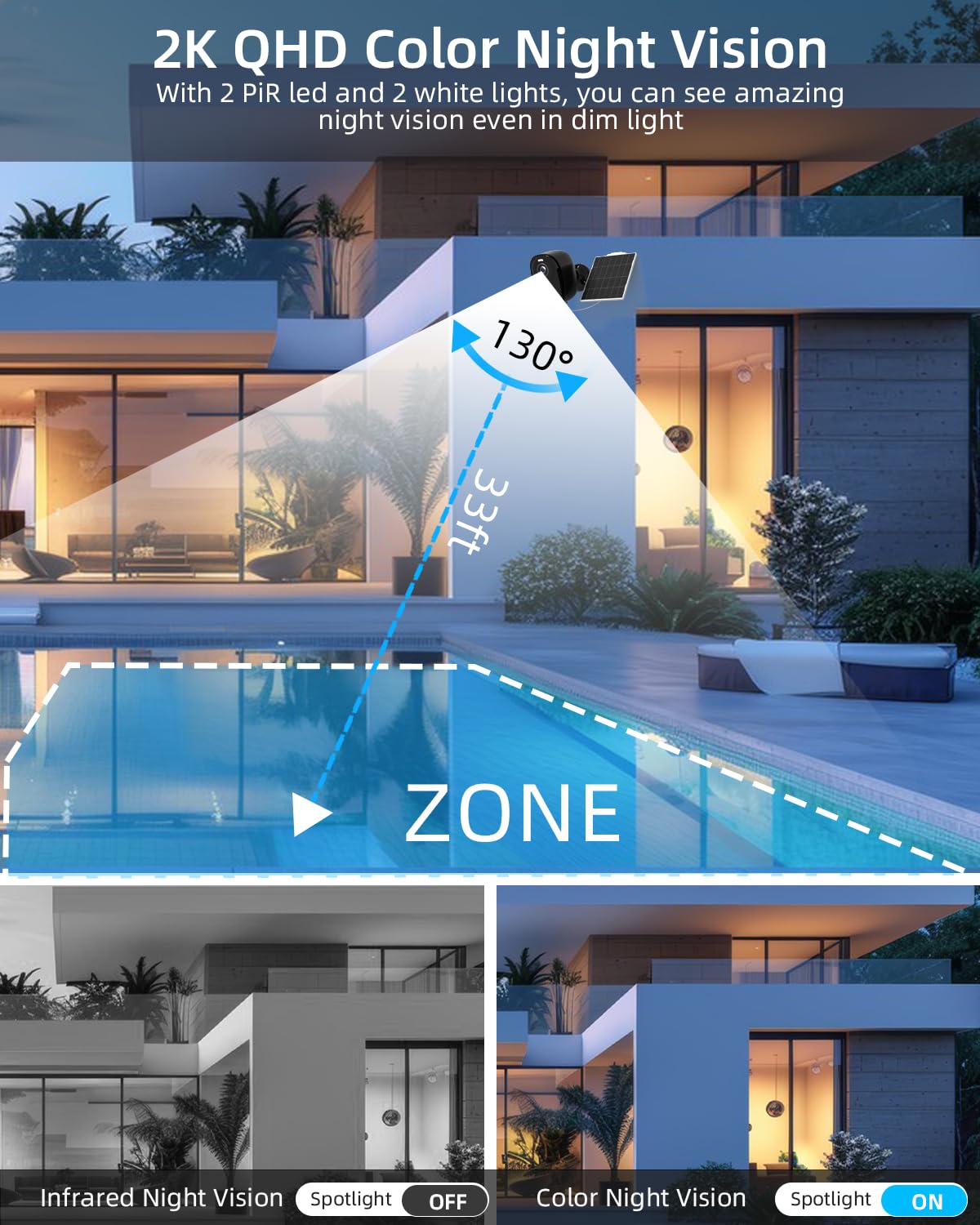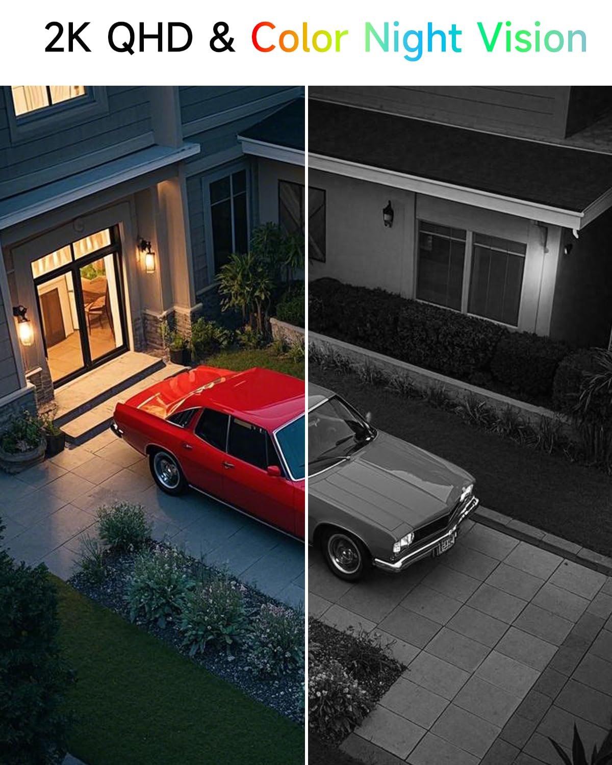 - 【2K Color Night Vision& IP65】 Keep an eye on your property 24/7 with stunning 2K QHD resolution and full-color night vision. Whether it's day or night, you'll get crystal-clear footage with a wide 130° view.The IP65 waterproof rating ensures this outdoor camera performs reliably in all weather conditions, making it perfect for securing your yard, driveway, or any outdoor area.