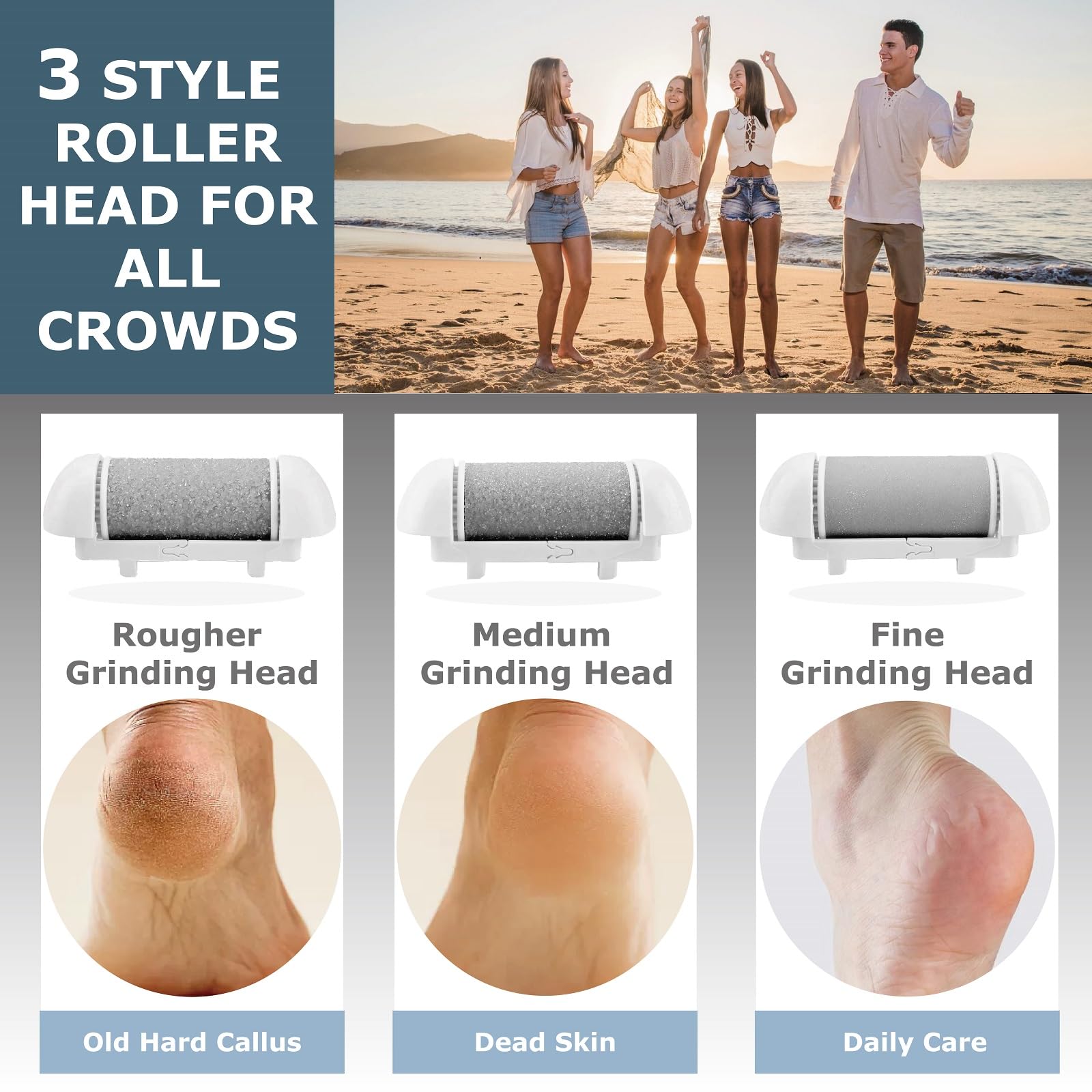 - WATERPROOF: This foot pedicure tool is IPX7 waterproof. You can wash the grinding head of the foot file safely after using it with no worries. 3 different heads for different foot conditions.