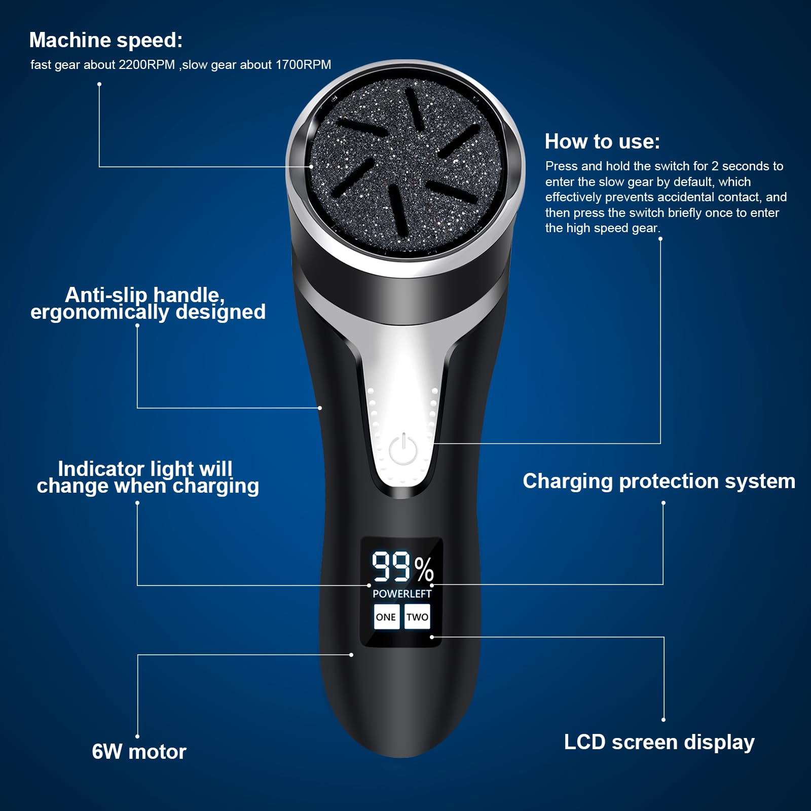 - LCD Power Display and Charging Protection: This electric callus remover has an LCD screen that shows the remaining power of the machine. With charging protection system to ensure charging safety and protect user safety.