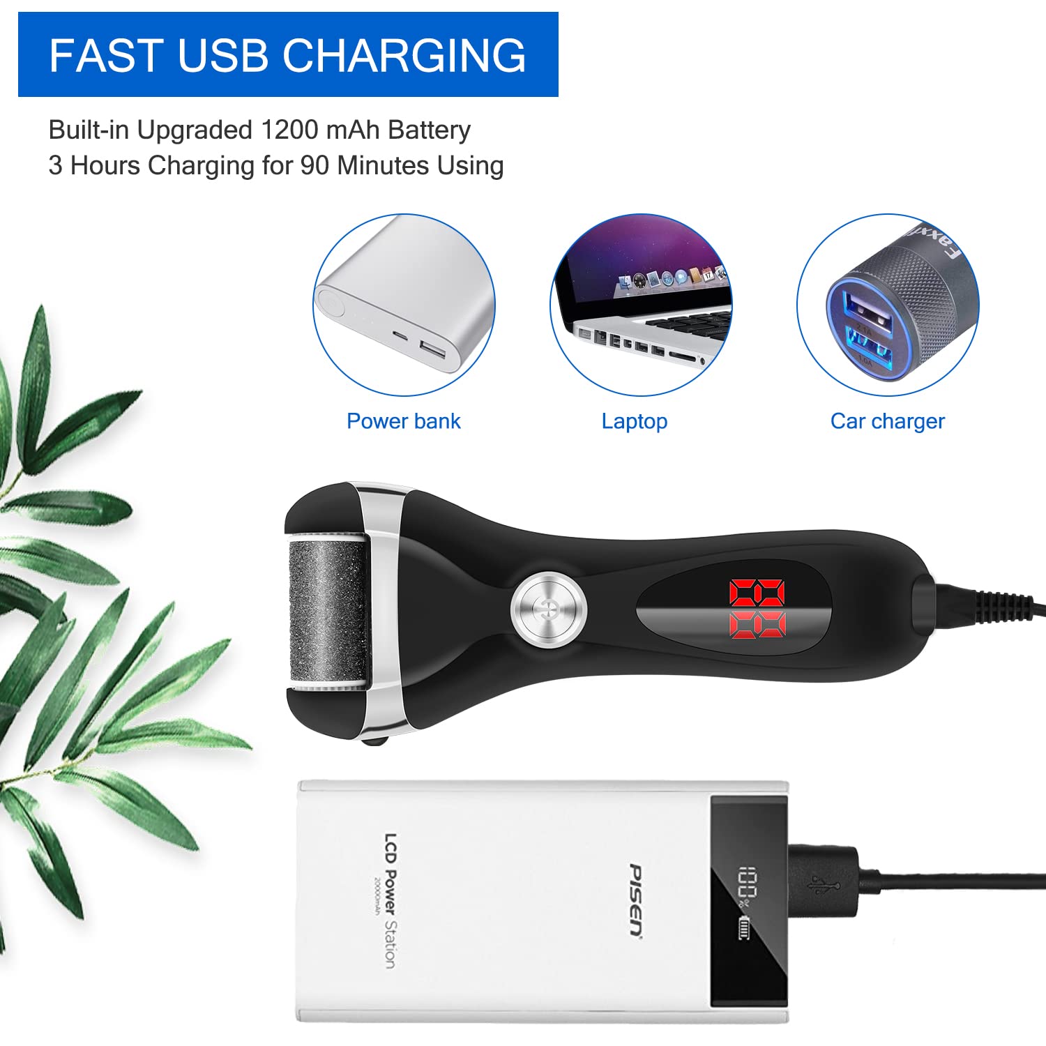 Electric Foot Callus Remover Kit, Elmchee Rechargeable Pedicure Tools Foot Care Feet File with 3 Roller Heads,2 Speed,Battery Display for Remove Cracked Heels Calluses and Dead Skin(Black)