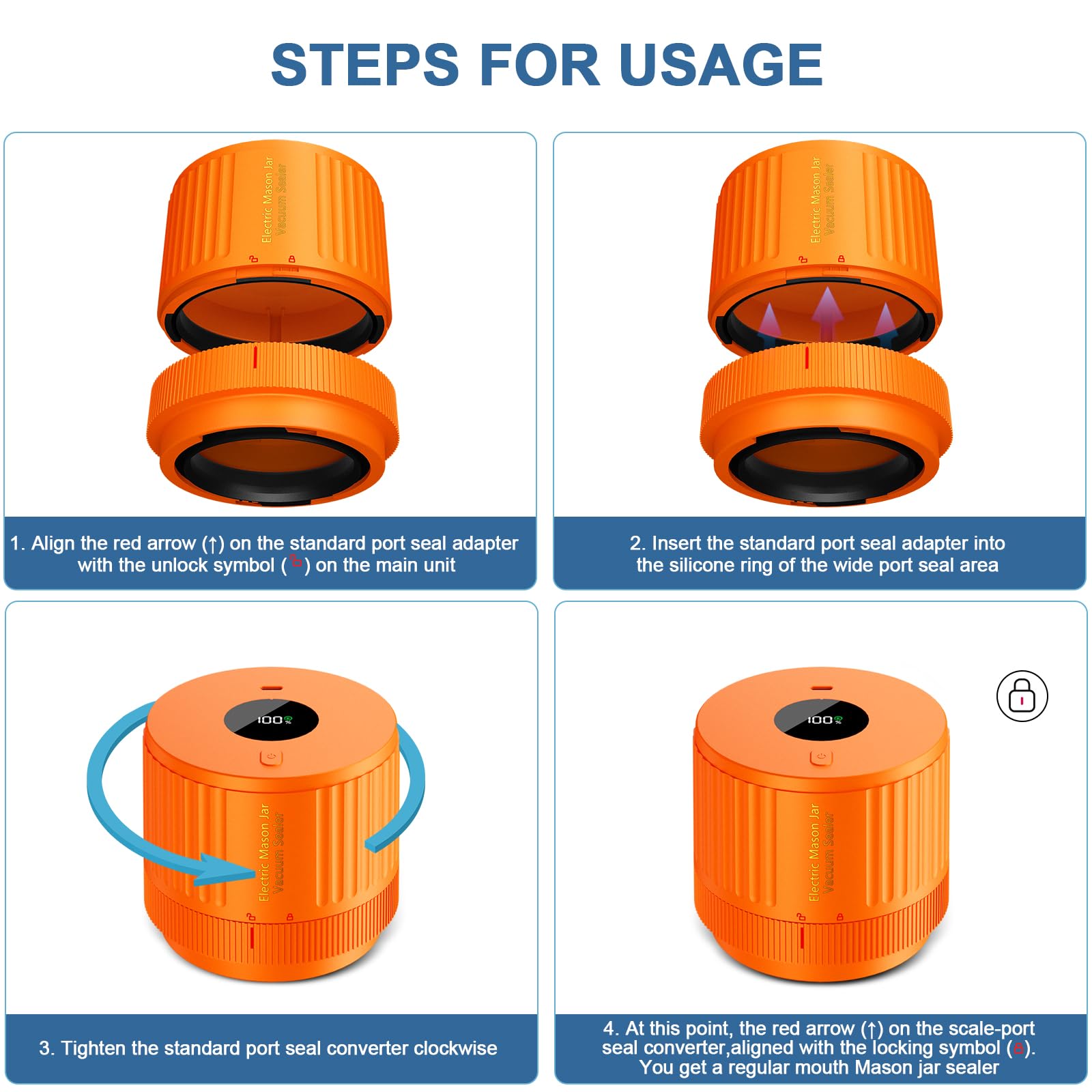 - 【Suitable for two types of Mason jars】The electric Mason jar vacuum sealer contains two sizes of mouth seals for your daily use. To get the standard mouth seal jar, simply insert the red arrow on the standard mouth seal converter, align it with the unlock symbol on the main unit and then insert it inside the silicone ring in the wide mouth seal area and tighten it clockwise, at this point the arrow is aligned with the lock symbol , which indicates a successful installation.