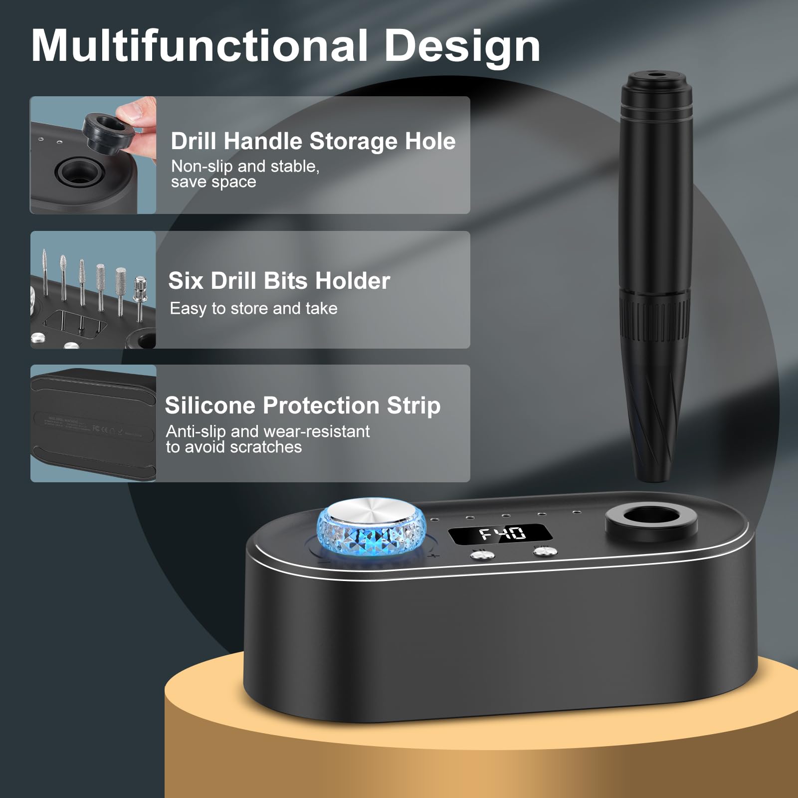 - Top-notch Appearance Design-Electric nail drill machine's compact design with a handpiece holder and 6 bit holders helps to save the space on your countertop and keep everything neat. There are anti-slip strips at the bottom of the machine to avoid scratching the desktop.Besides, acrylic nail drills comes with a USB port which can quickly charge your phone as well.