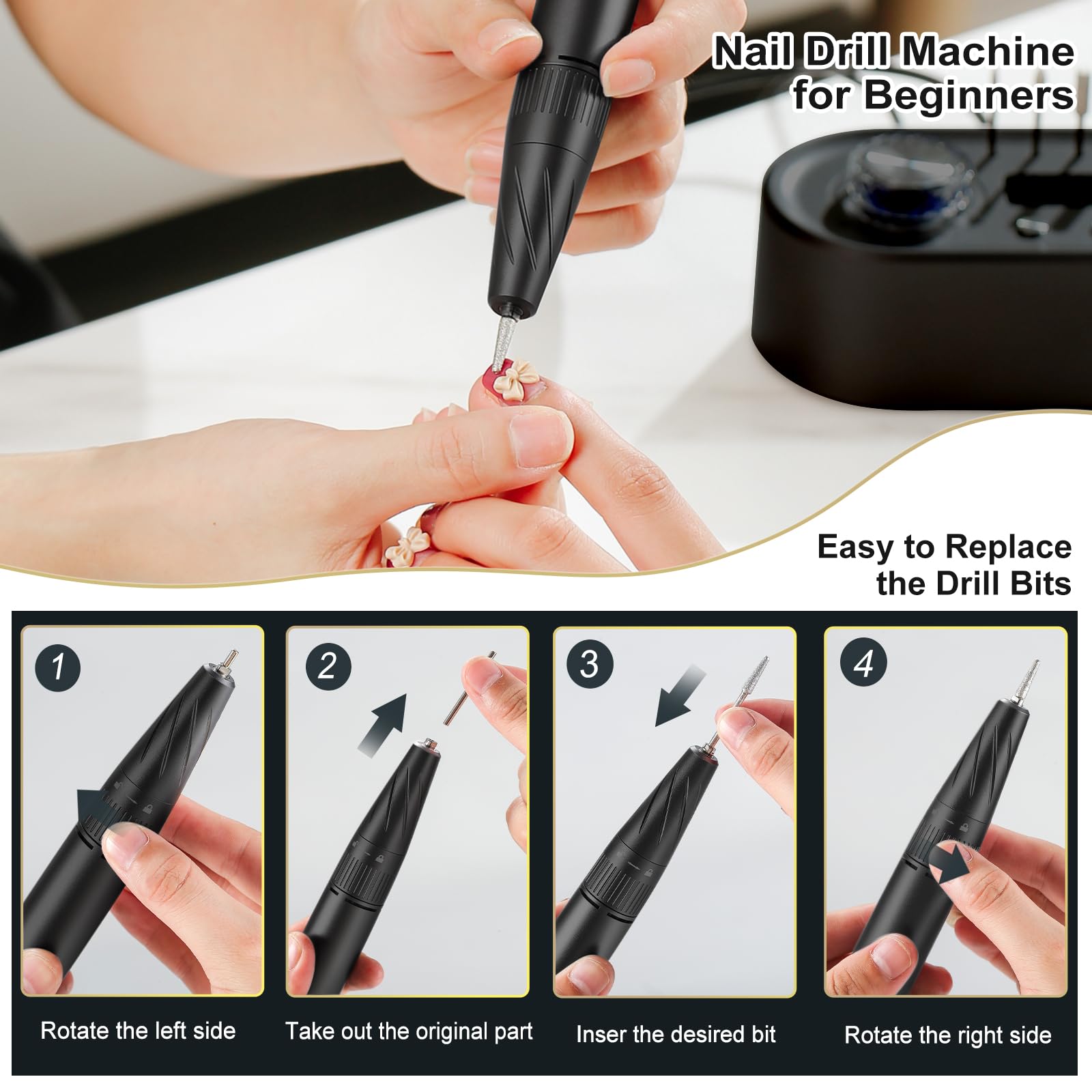 - Professional Nail Drill Machine Set–E file nail drill is designed for beginners and professionals, perfect for in and out of the salon and nail art DIYers, ideal for buffing nails, filing nail shapes, and smoothing calluses on hands and feet. Nail grinder is a perfect gift for wife, sister, daughter, mom, best friend, girlfriend or a gift for yourself.