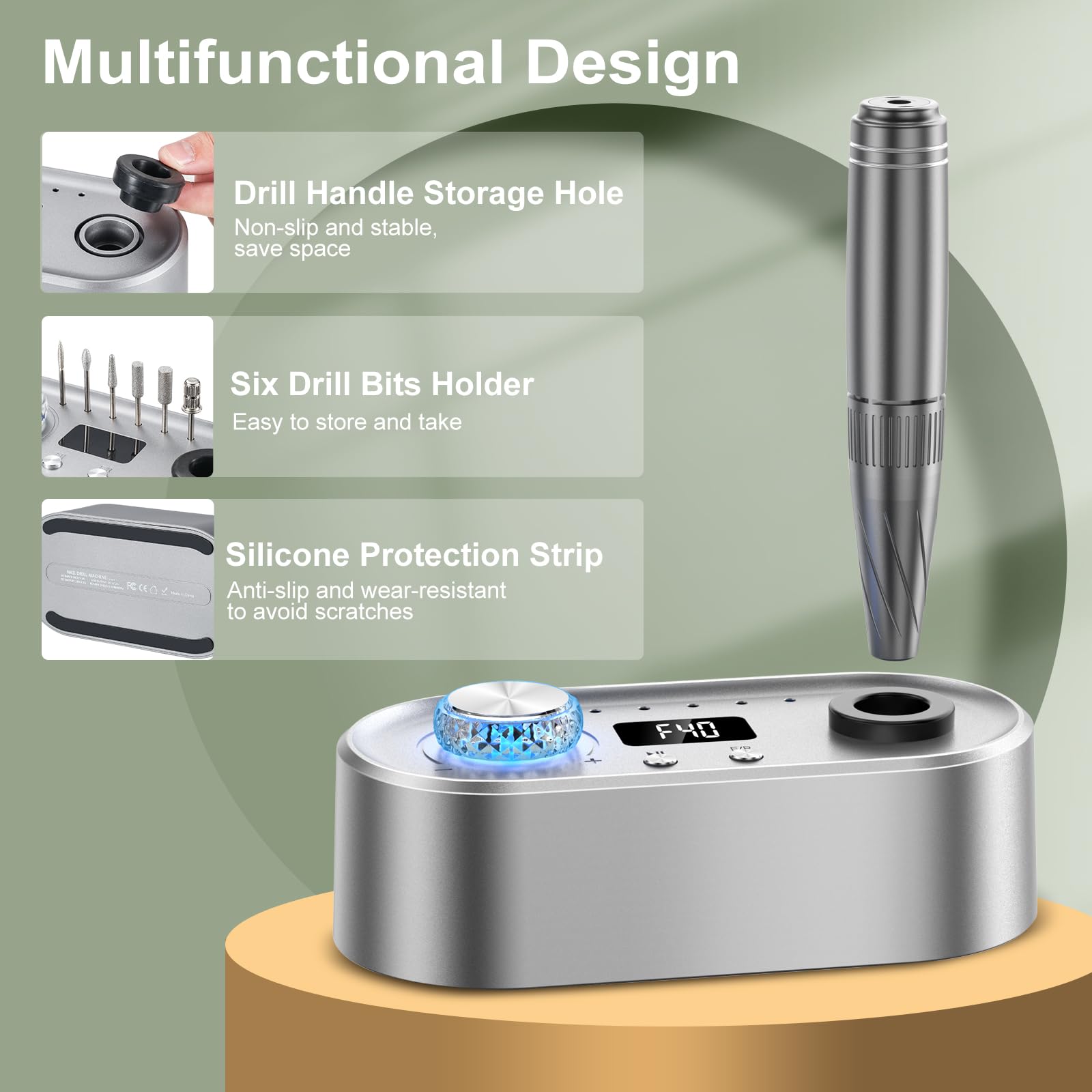 - Top-notch Appearance Design-Electric nail drill machine's compact design with a handpiece holder and 6 bit holders helps to save the space on your countertop and keep everything neat. There are anti-slip strips at the bottom of the machine to avoid scratching the desktop.Besides, acrylic nail drills comes with a USB port which can quickly charge your phone as well.