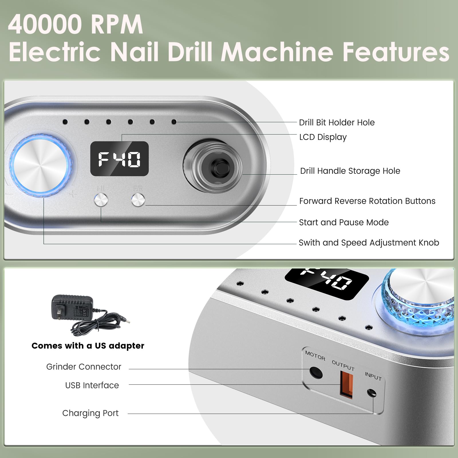 Electric Nail Drill Machine, 40000RPM Professional E File Nail Drill Kit for Gel Acrylic Nails,High Speed Low Vibration Low Heat Nail Grinding with LED Light, 7 Bits, F/R Rotation, LCD Screen (Grey)