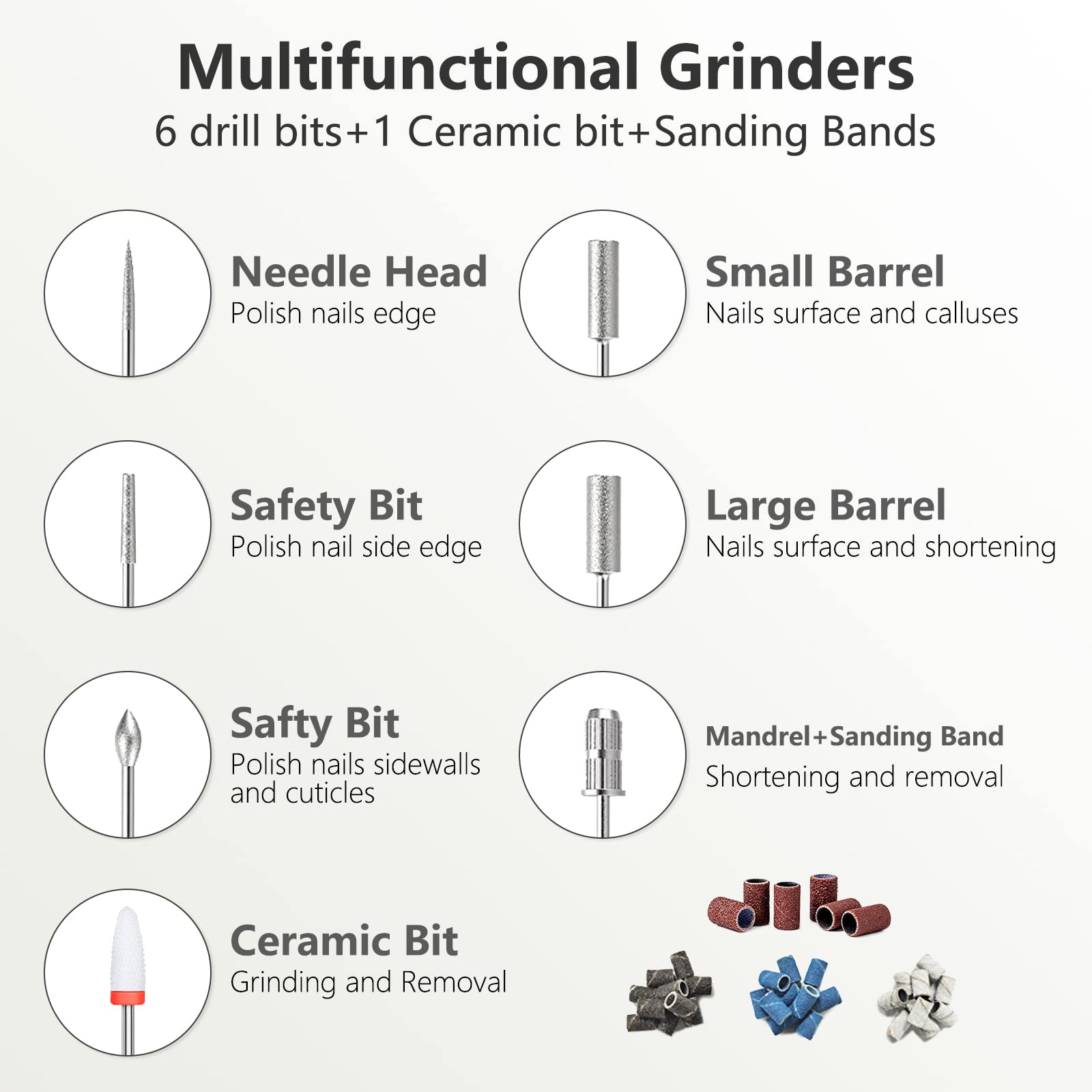 - Professional Electric Nail Drill Kit:comes with 6 kinds of metal drill bits and 1ceramic bit,which can meet various manicure and pedicure needs: acrylic nails, gel nails, dip powder nails, cuticle and dead skin, calluses,thick nails.