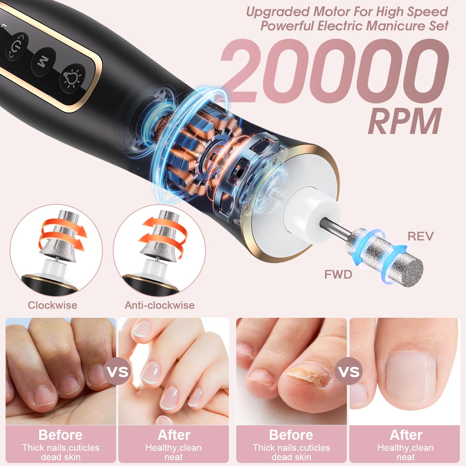 - Professional Manicure and Pedicure Set: This electric nail file is design for hand and foot care, can be used for all-around shaping, buffing, grinding, polishing, cuticle, hard skin, callus removing. perfect manicure kit for women trimming, grinding and polishing natural nails and toe nail grinder kit for thick nails. You will enjoy this manicure pedicure tool kits !!!