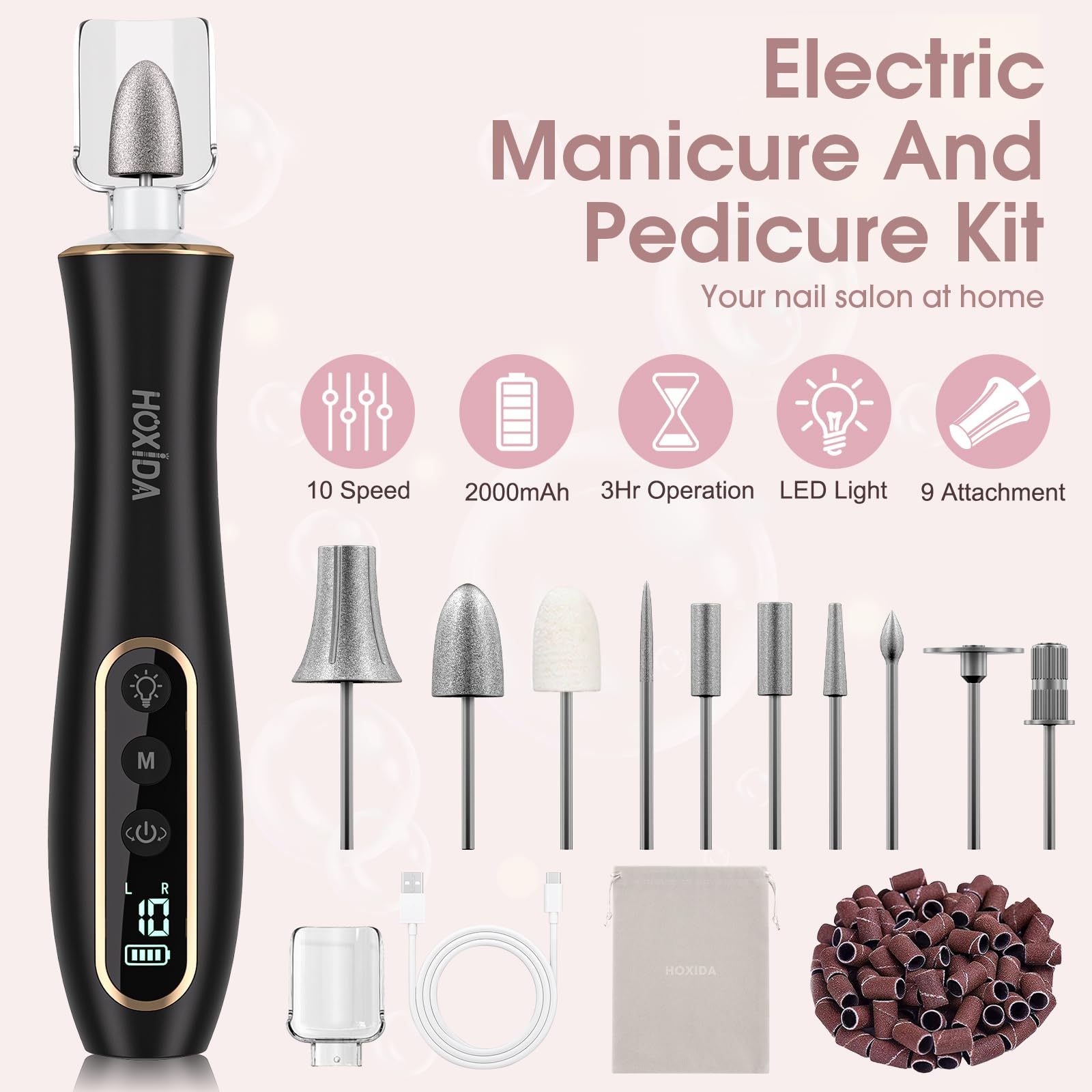- Sturdy, Low Noise, Low Heat : Hoxida manicure and pedicure tools kit is built to last, with a powerful yet quiet motor with smart heat dissipation, keep the pedicure drill machine is in low noise, low heat while using it. a perfect home pedicure manicure kit for doing your own mani and pedi.with ergonomic body design for comfortable holding, speed and direction controlling. Easy to use, enjoy a salon-quality professional manicure pedicure at home.