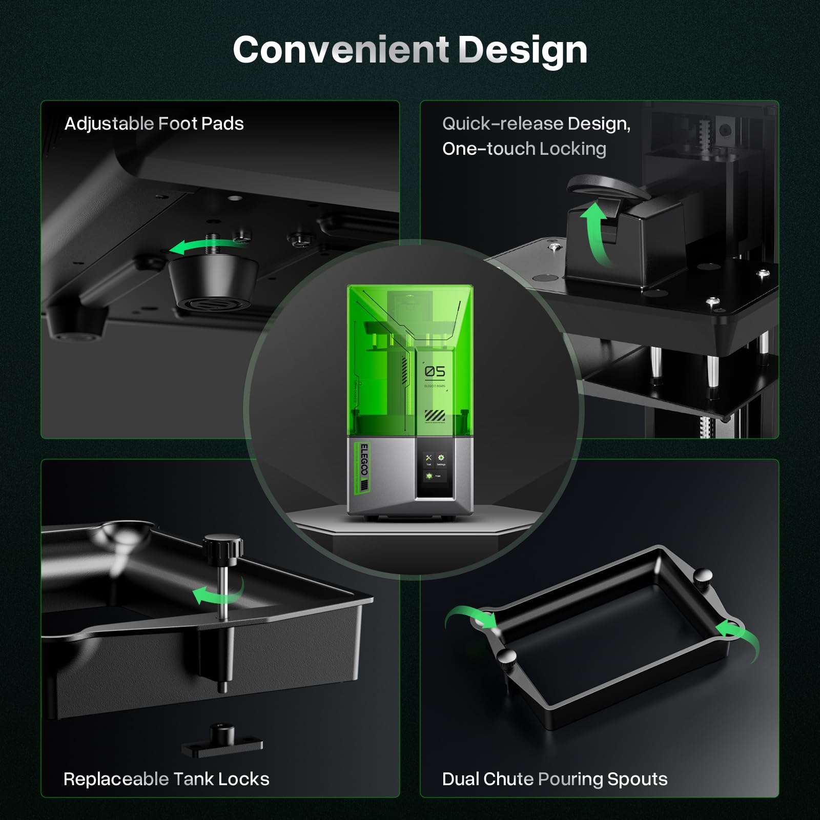 - 【User-Friendly Design】ELEGOO Mars 5 offers upgrades like adjustable foot pads, one-touch build plate locking, replaceable tank lock, dual chute pouring spouts, and a laser-engraved platform for better adhesion. It features a resistive touch screen and vertical interface for easy operation