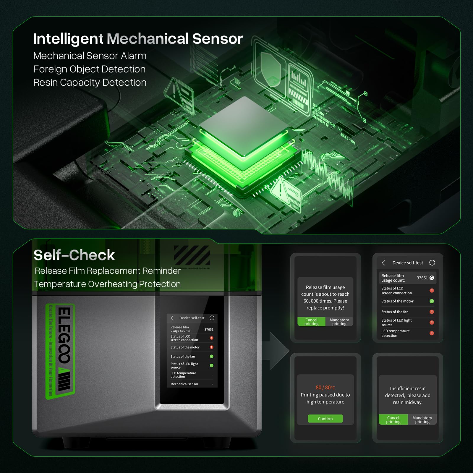 - 【Intelligent Mechanical Sensor】ELEGOO Mars 5 3D printer features a built-in intelligent mechanical sensor that detects printing issues like low resin, foreign objects, release film replacement, and overheating. Its self-check function enhances the safety and reliability of the printing process