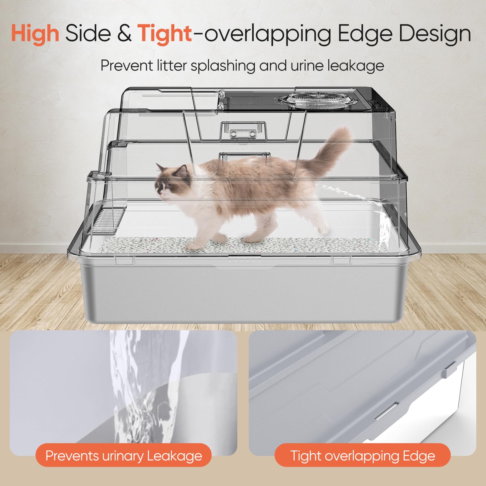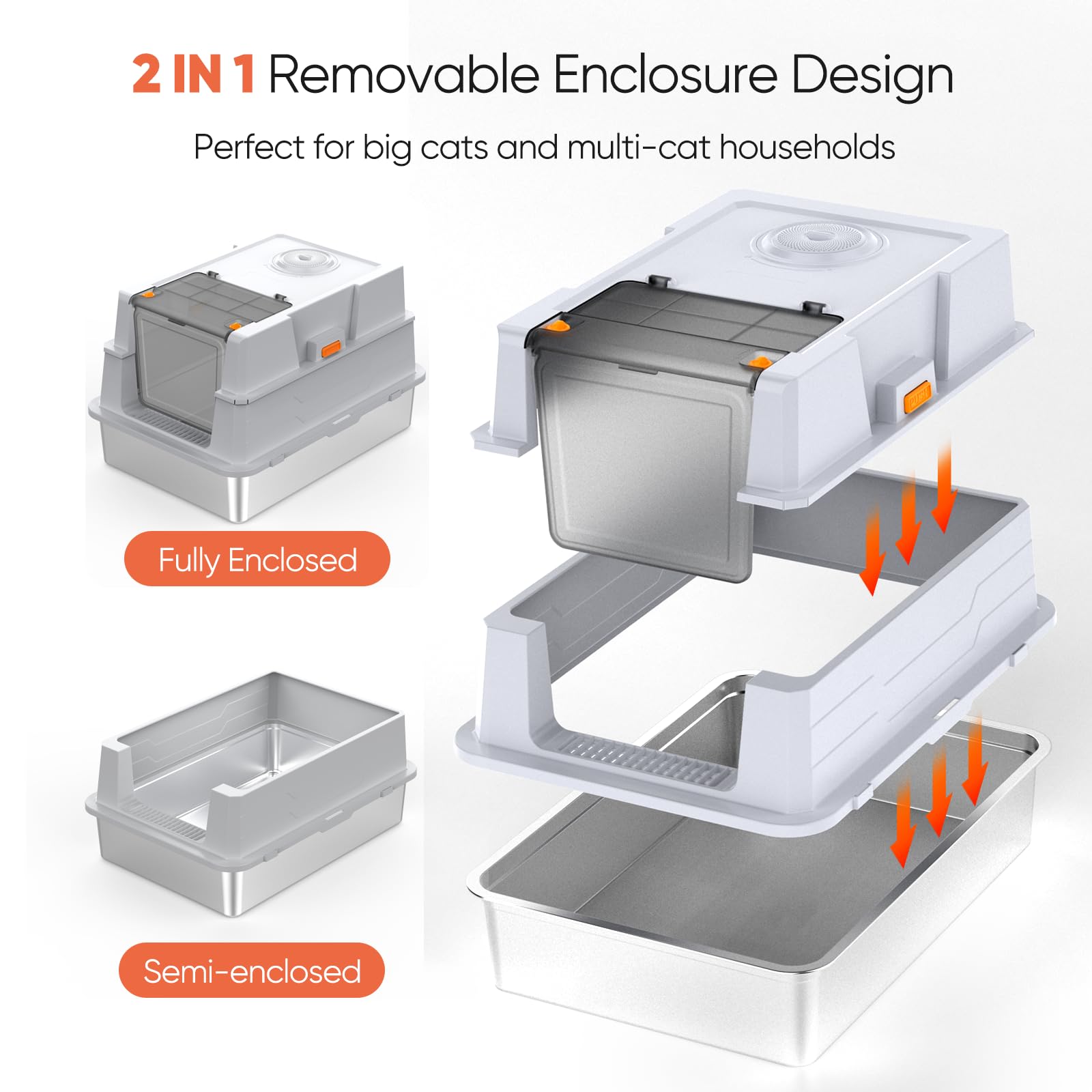 - 【FULLY ENCLOSED, SEMI-ENCLOSED AND FULLY OPEN】 our stainless steel cat litter box features an easy-to-assemble, 3-layer detachable shell that offers fully enclosed and semi-enclosed and fully open configurations. the fully enclosed mode can prevent the spread of odors and protect your cat from interference from other pets, while the fully open mode can promote ventilation the semi-enclosed make cleaning more convenient.