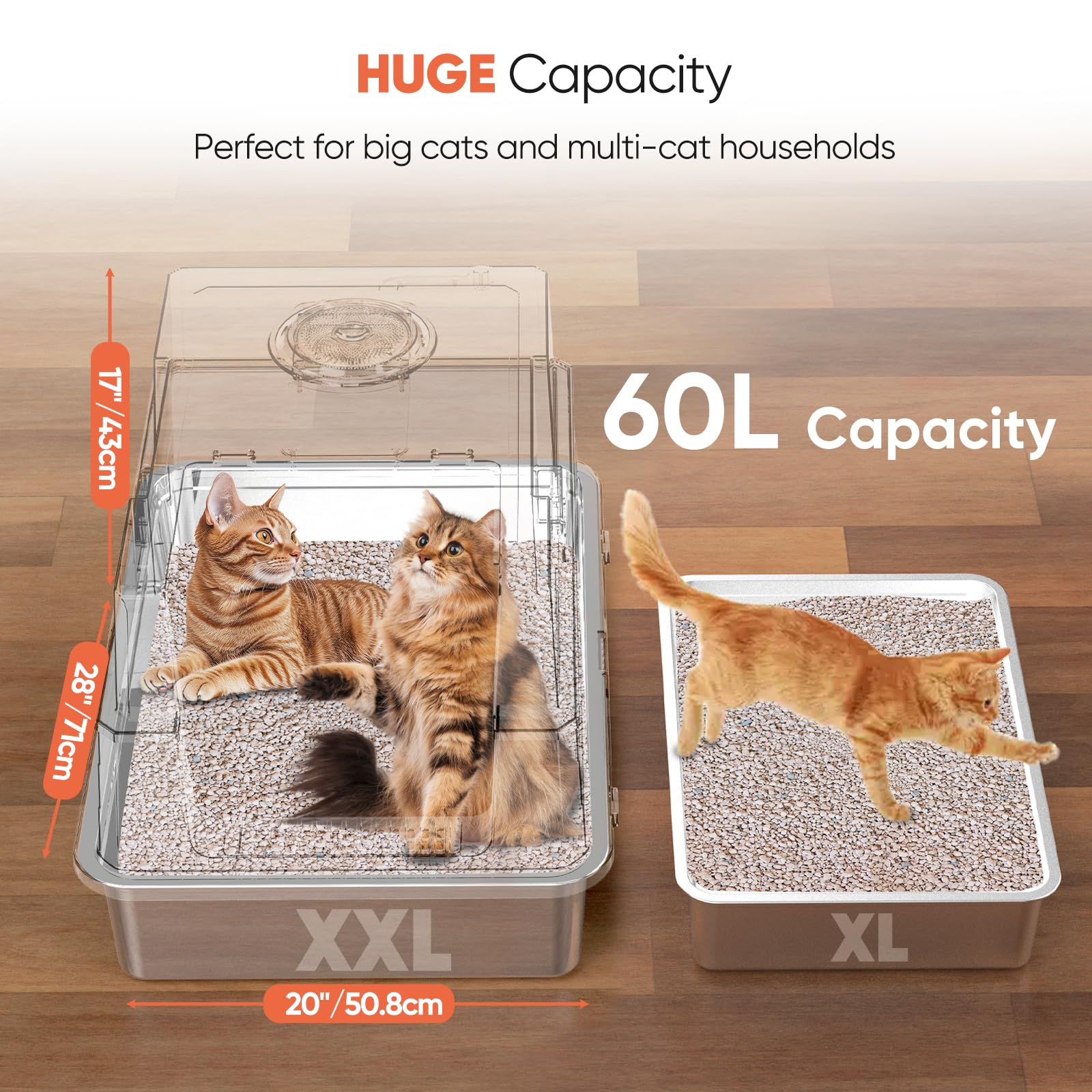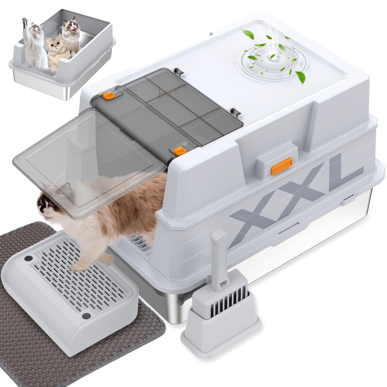 ELEGX XXXL Extra Large 28" L×20" W Odor-Control Stainless Steel Cat Litter Box, 4-in-1 Cat Metal Litter Box Set,Enclosed Removable Metal Litter Box with High Sided Enclosure,Mat & Scoop