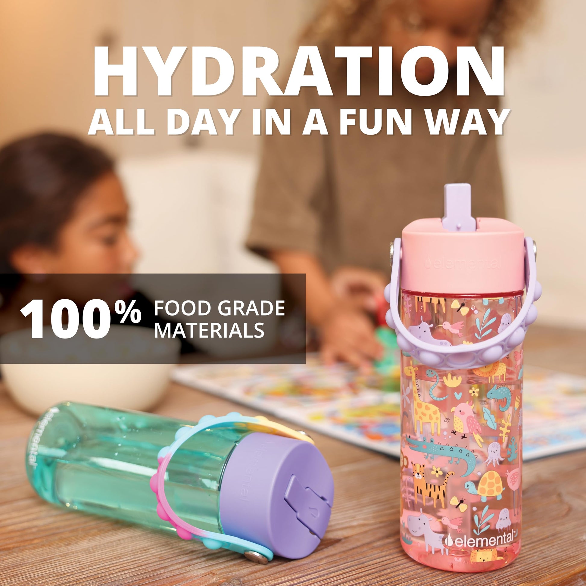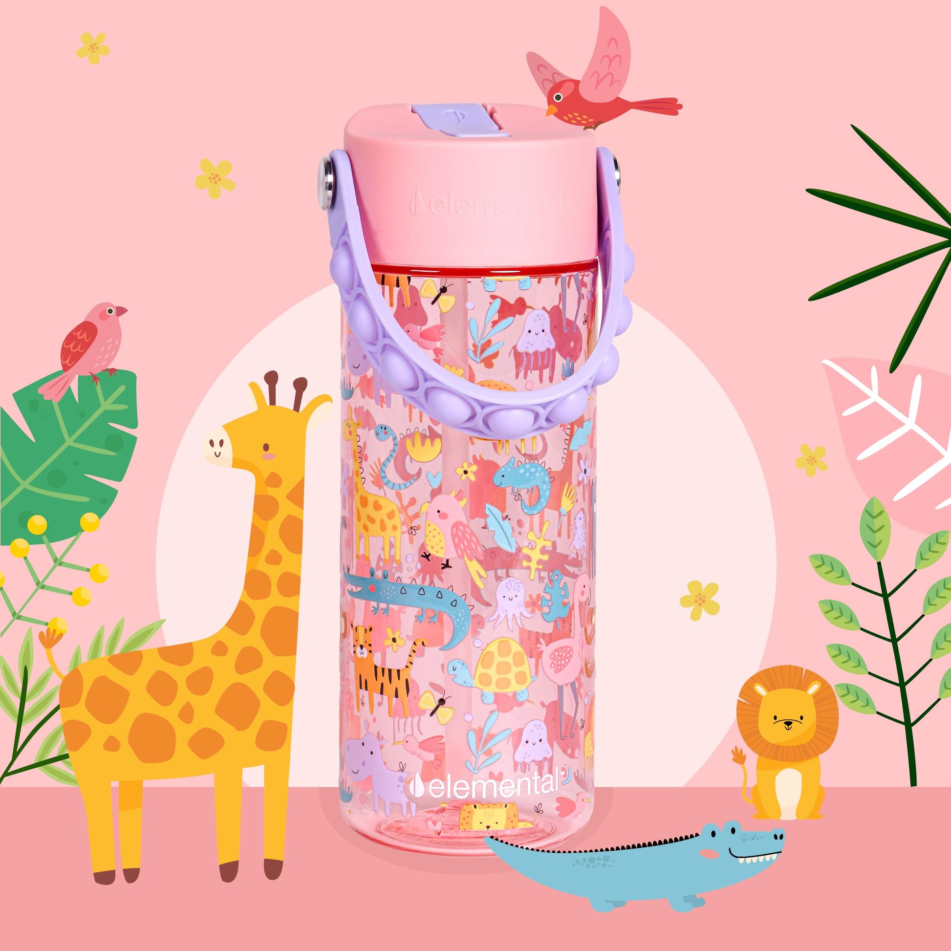 Elemental Leak Proof Water Bottles for Kids - Splash Kids Water Bottle for School with Fun Fidget Pop-it Handle - BPA Free Tritan Plastic Reusable Water Bottle with Straw - Pink Safari - 18oz
