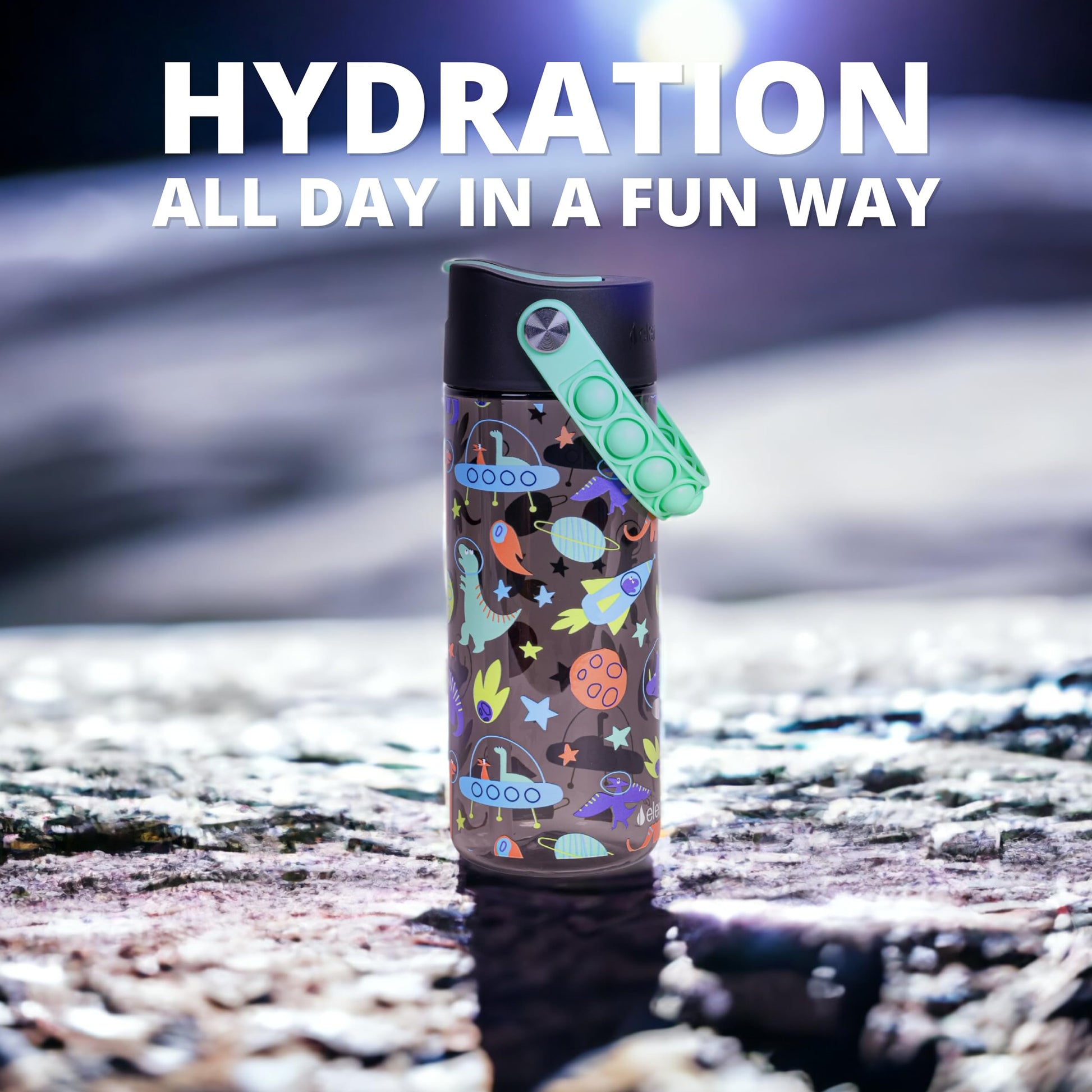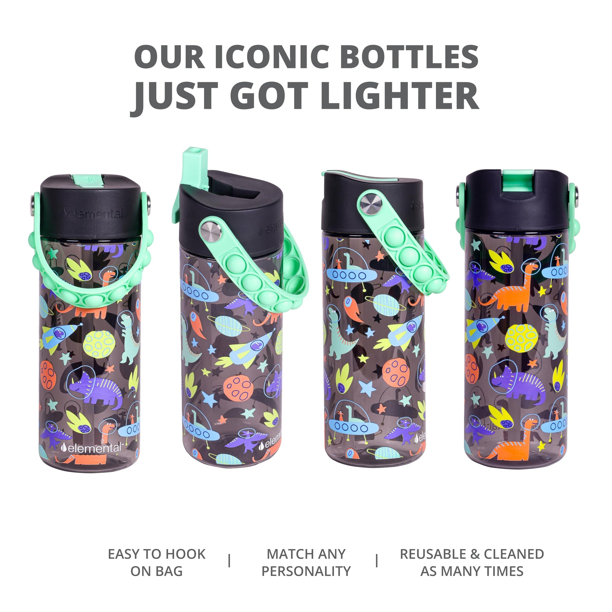 Elemental Leak Proof Water Bottles for Kids - Splash Kids Water Bottle for School with Fun Fidget Pop-it Handle - BPA Free Tritan Plastic Reusable Water Bottle with Straw - Space Dinosaur - 18oz
