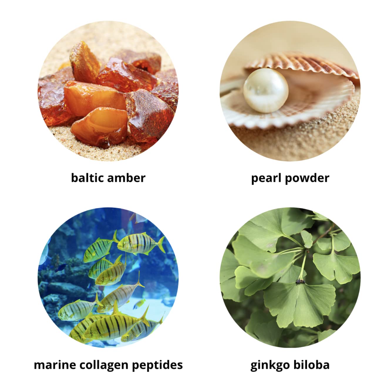 - Infused with Baltic amber, collagen peptides, and powerful botanicals to improve elasticity and soften the appearance of fine lines.