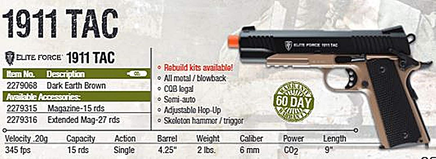 Details: The Elite Force 1911 TAC Airsoft Pistol has an ultra-realistic all-metal construction. The slide action blowback is highly realistic and fun to shoot. This 1911 airsoft pistol has a 14-round drop free mag and a 14 mm threaded tip. An adjustable Hop-Up will keep you shooting straight in all situations.