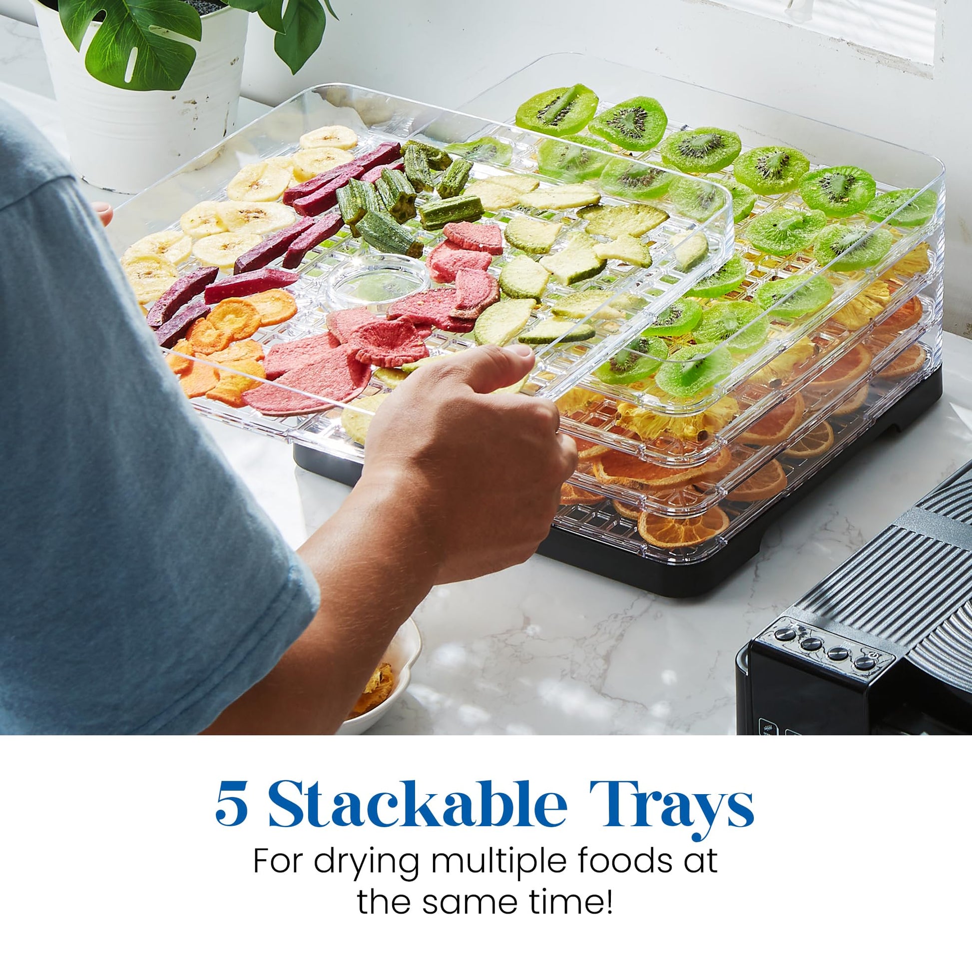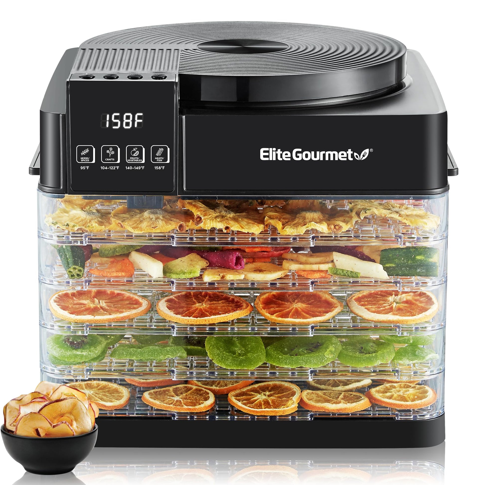 Elite Gourmet EFD422 Digital Food Dehydrator with 5 BPA Free Trays, Top Mounted Fan & Heater, Adjustable Timer and Temperature Controls, Jerky, Herbs, Fruit, Veggies, Snacks, Black