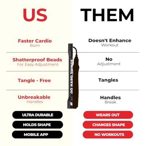 - Quality Materials; We make high quality products for competitive jump rope athletes. This Do Hard Things skipping rope features our 5' unbreakable plastic polymer handles and 1' shatterproof plastic beads. This adjustable jump rope is a durable workout jump rope that can be used indoors/outdoors.