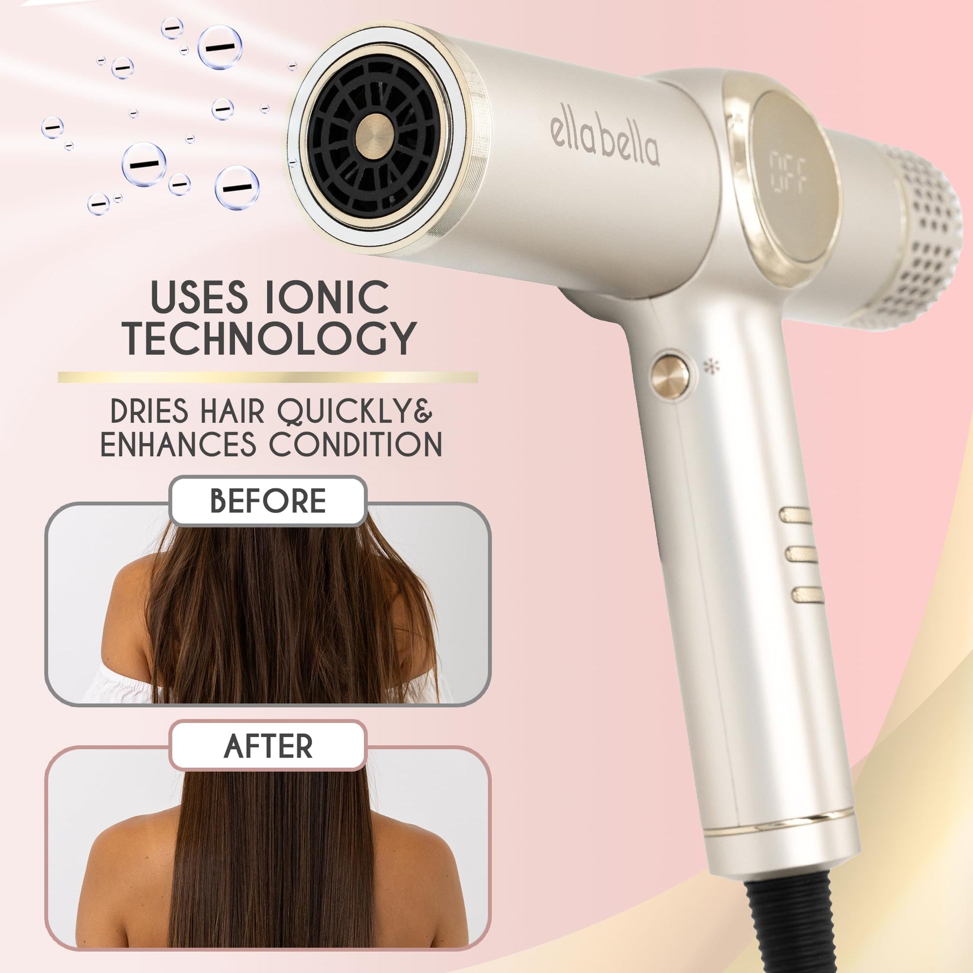 ELLA BELLA® Professional Ionic Hair Dryer with Diffuser • Negative Ion Blow Dryer • Suitable All Hair Types • Intelligent Heat Control & Rapid Drying Speeds • Lightweight Design • Low Noise Technology