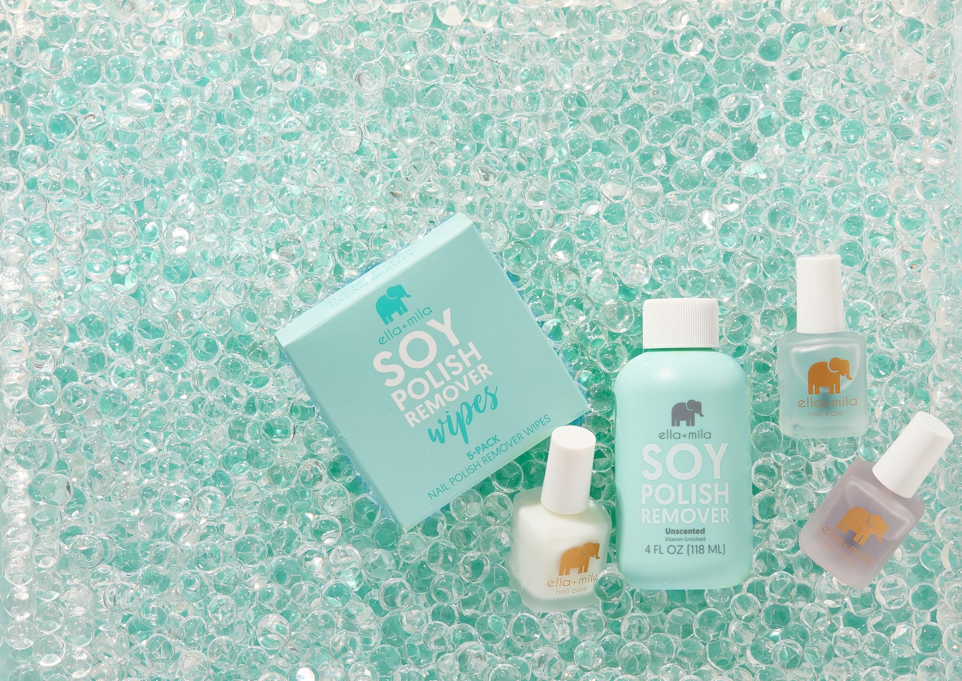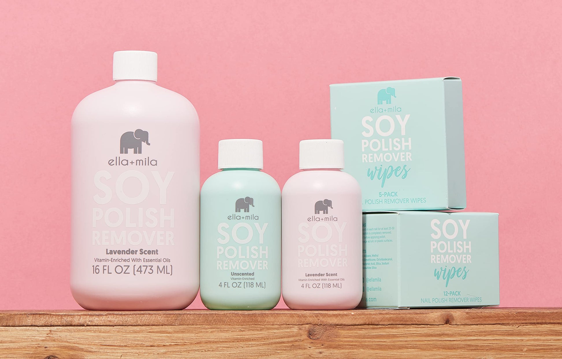 - Soy Based Nail Polish Remover by ella+mila: Non-toxic nail polish remover made without acetone & alcohol; Formulated to effectively remove natural nail polishes; Not intended for gel polish; Unscented & enriched with vitamins A, C & E to promote healthy & moisturized nails