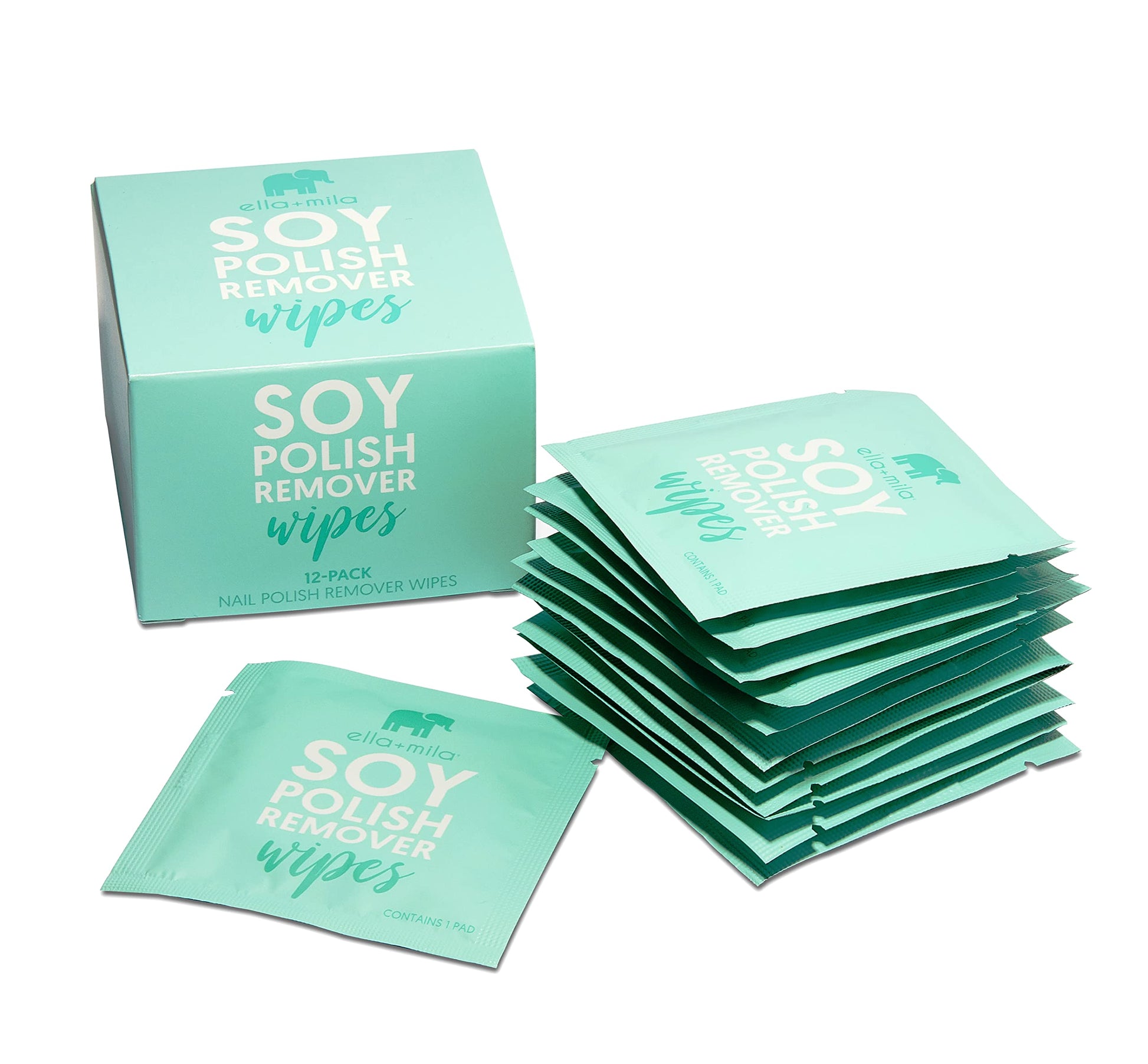 ella+mila Soy Nail Polish Remover Wipes Non-Acetone Lint Free Nail Wipes - Non-Toxic Fingernail Polish Remover - Unscented & Enriched with Vitamins A,C & E (12 Pack)