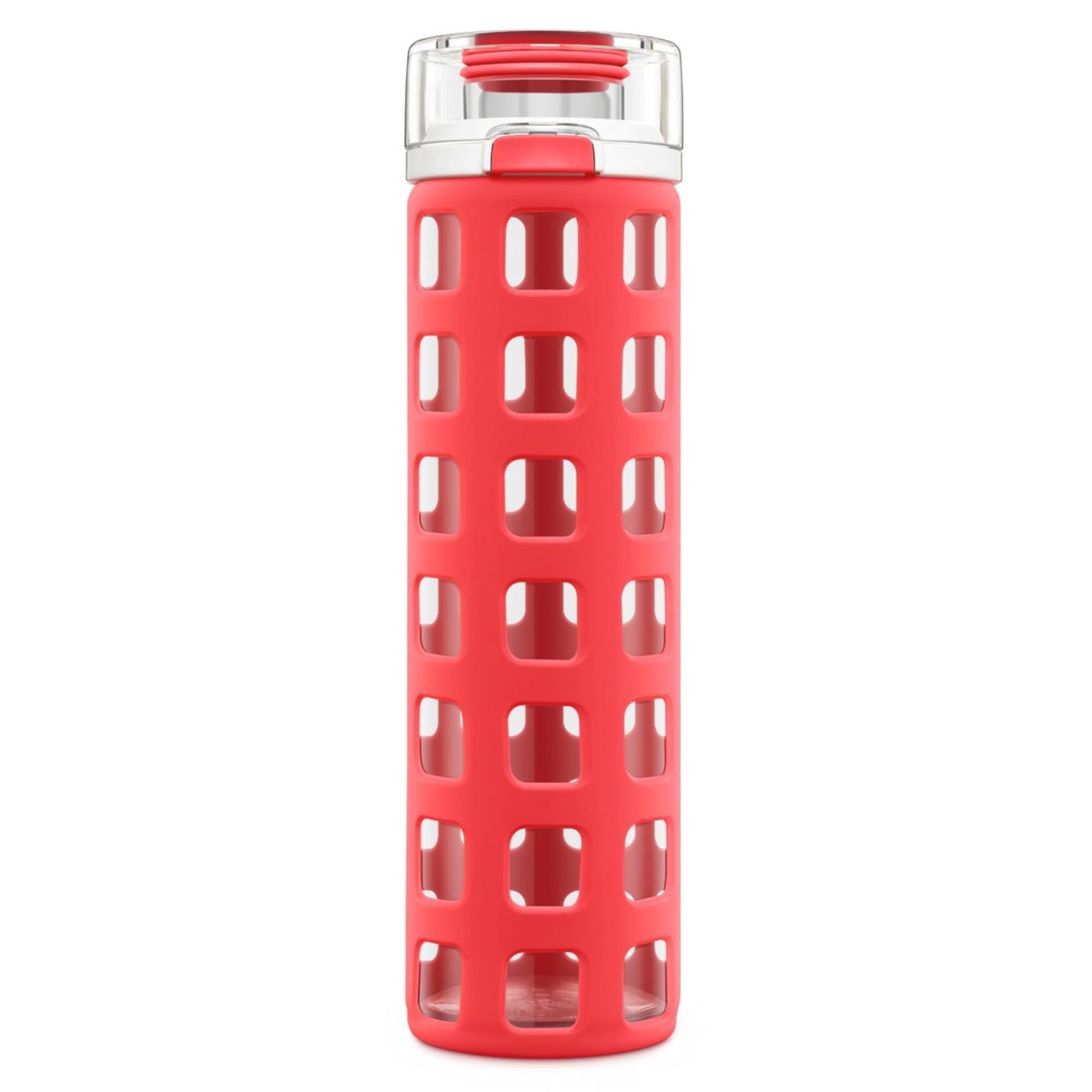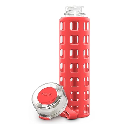 Ello Syndicate Glass Water Bottle with One-Touch Flip Lid and Protective Silicone Sleeve and Carry Loop, BPA Free, Dishwasher Safe, Coral, 20oz