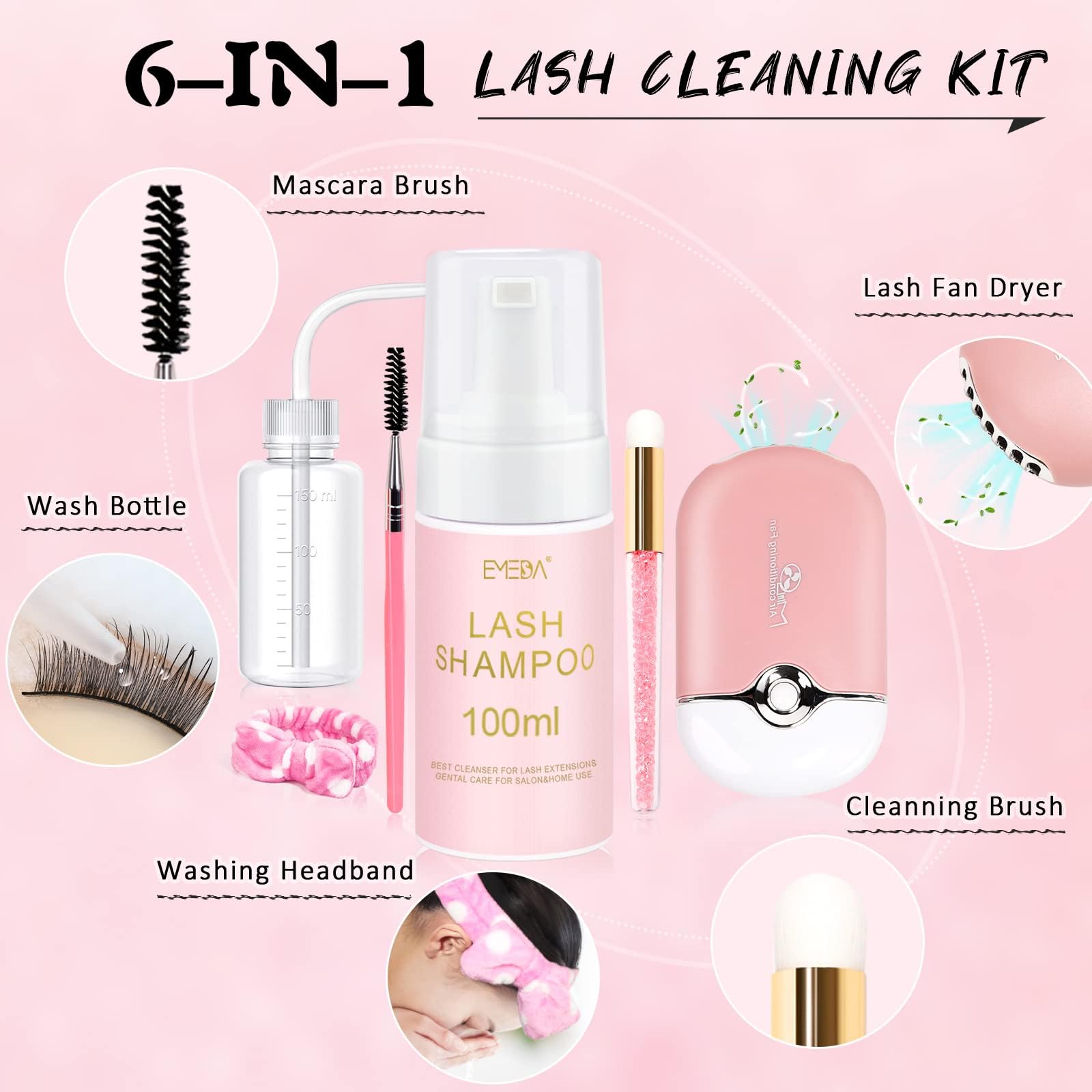 - Professional Lash Extension Cleaning Kit For Home&Salon: Lash extension shampoo kit comes from shampoo 100 ml/3.38 oz-1 pc 150ml foam lash shampoo bottle - 1pc USB mini portable fans - 1pc crystal handle and soft head lash shampoo brush - 1pc beauty hair band - 1pc eyelash brush - 1pc delicate cosmetic bag.