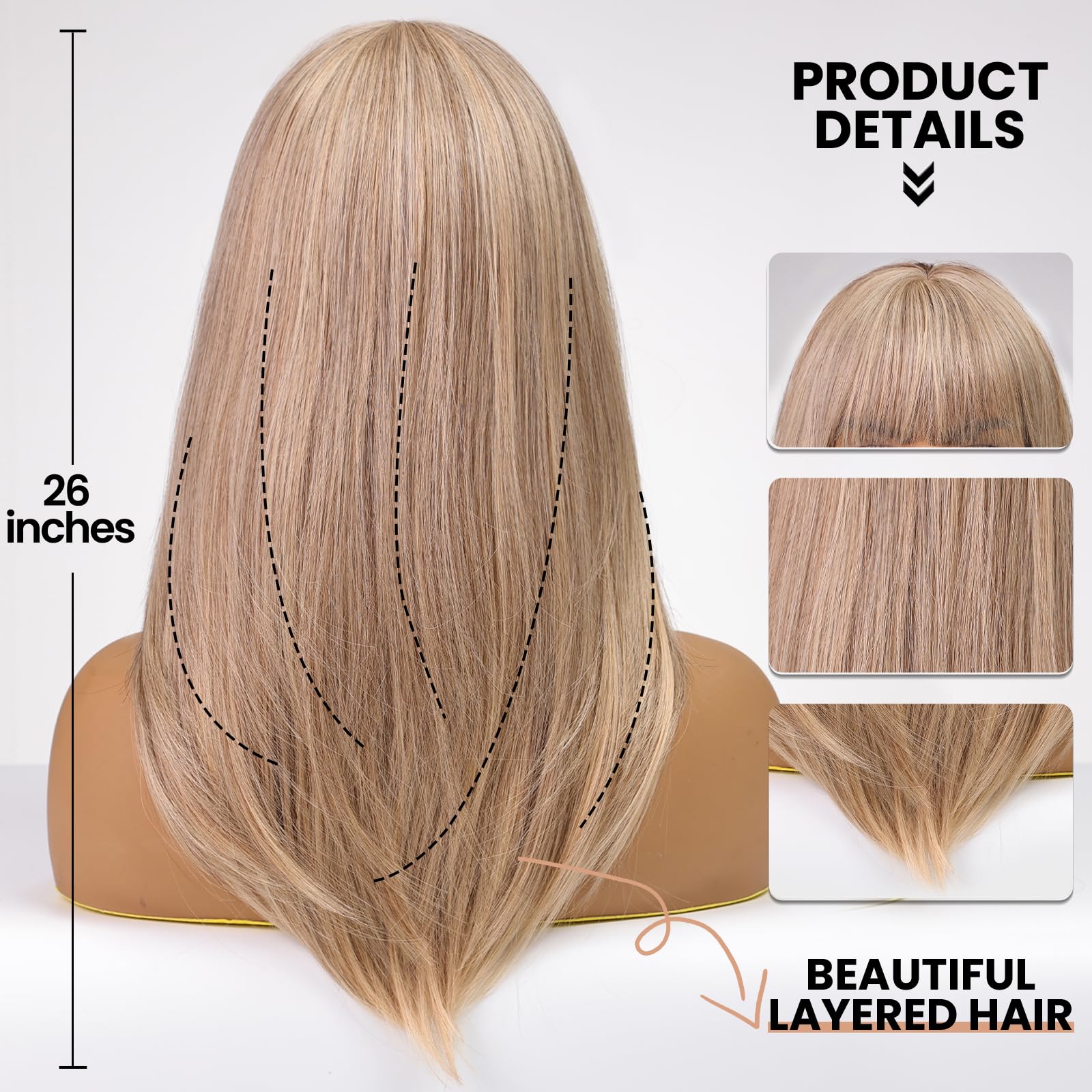 EMMOR Brown Wig With Bangs For Women Long Straight Wigs Synthetic Layered Hairstyle For Girls Party Cosplay And Daily Use(26" Ash Blonde)