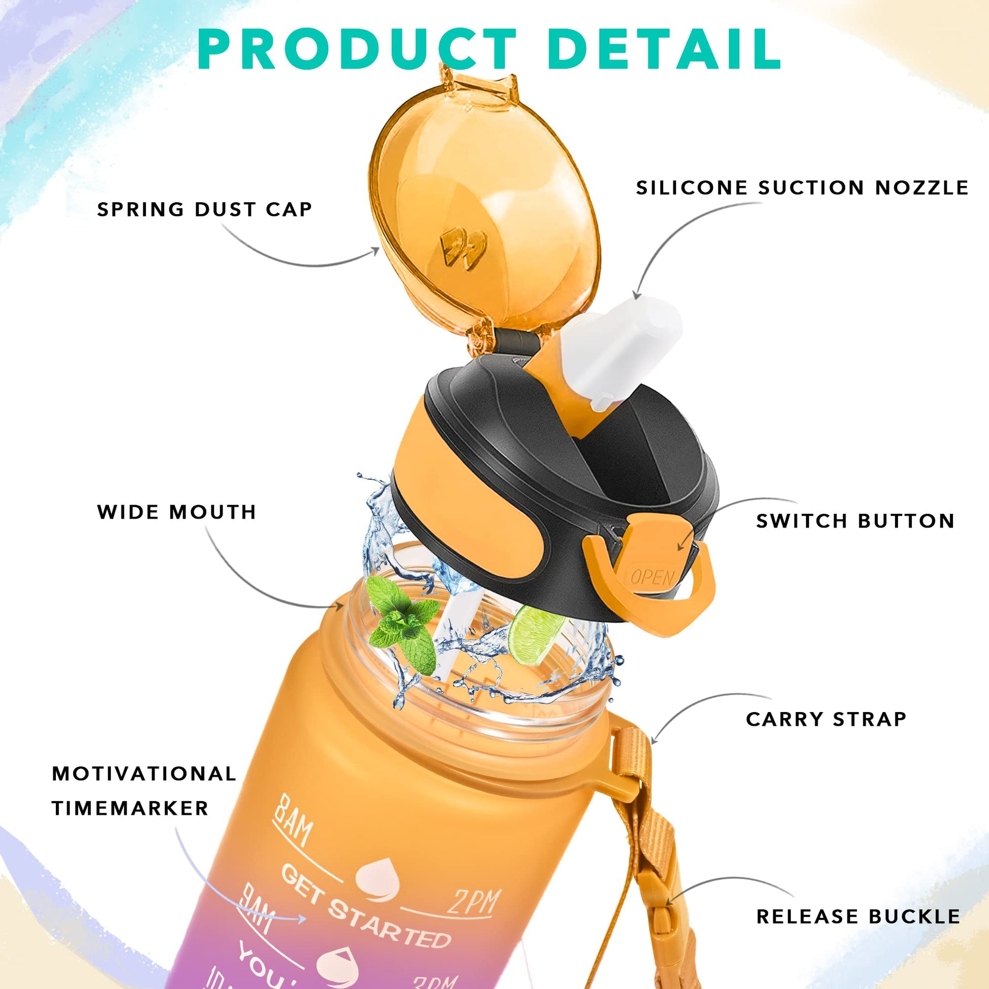 Details: 32oz Motivational Water Bottles with Time to Drink, Large Daily Water Bottle with Portable Top Lid & Removable Straw, Leakproof BPA Free Water Bottle with Time Maker for Fitness and Outdoor Sports