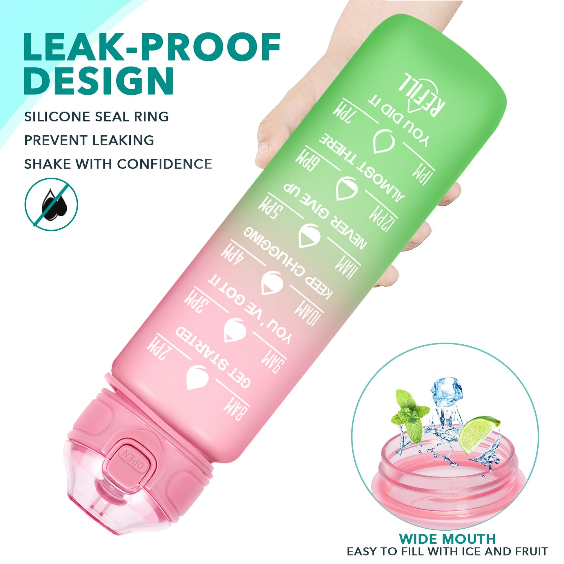 - 【Motivational Quote & Time Marker】32 oz water bottle with unique inspiration quote and time marker, reminding you to stay hydrated. The capacity marker helps you tracking daily water intake. A silicone straw makes you enjoy spill-proof sipping without effort. A necessary have for people of different occupations such as athletes and white-collar workers.
