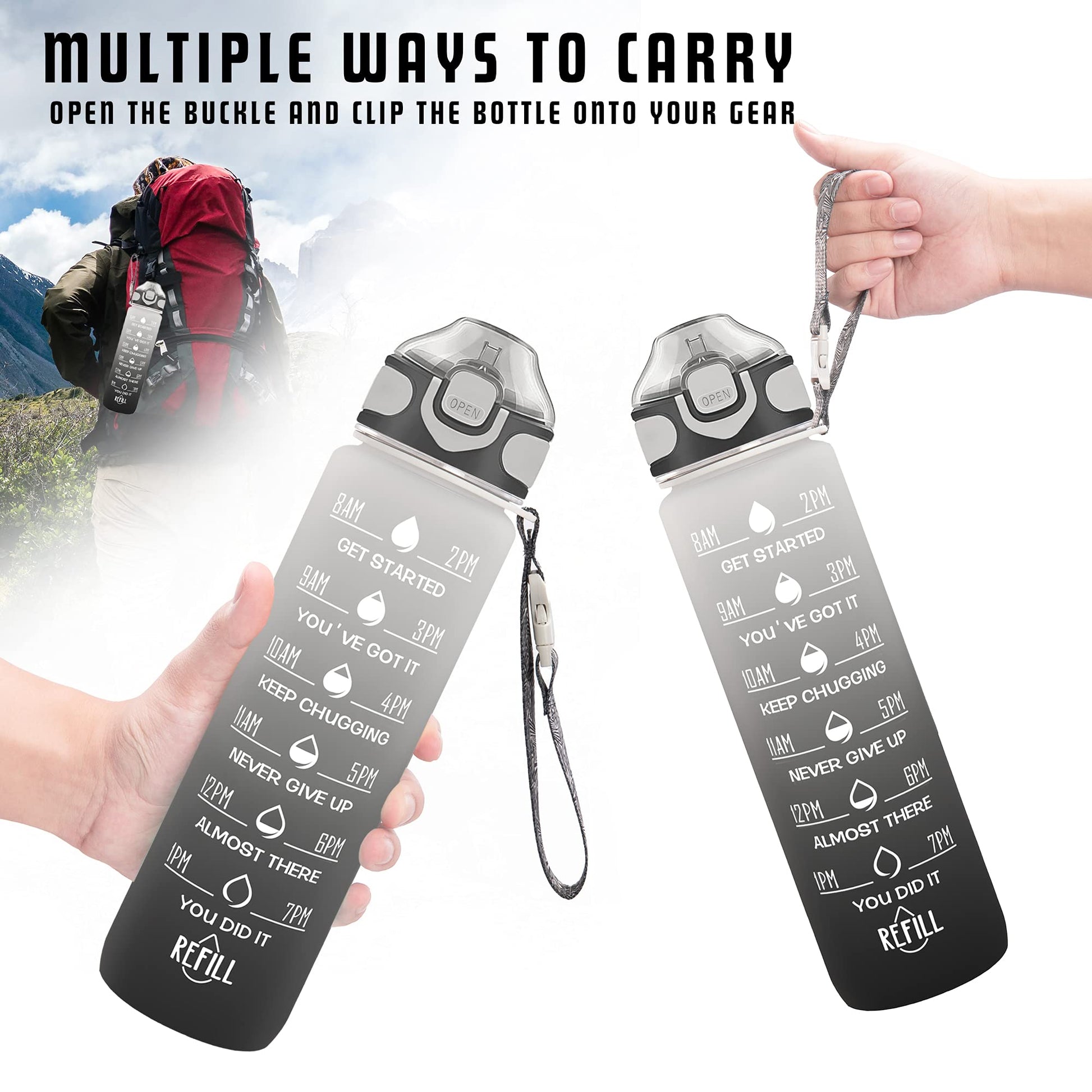 - 【Buckle Handle Design】Our water bottle with carrying strap and release buckle, you can choose hands-free or handle type, convenient for you to connect 32 oz water bottle to your backpack, bike, or travel bag. Featuring a wide mouth opening, easy to clean and add ice. Ideal for travel, hiking, gym, and any indoor & outdoor activities.
