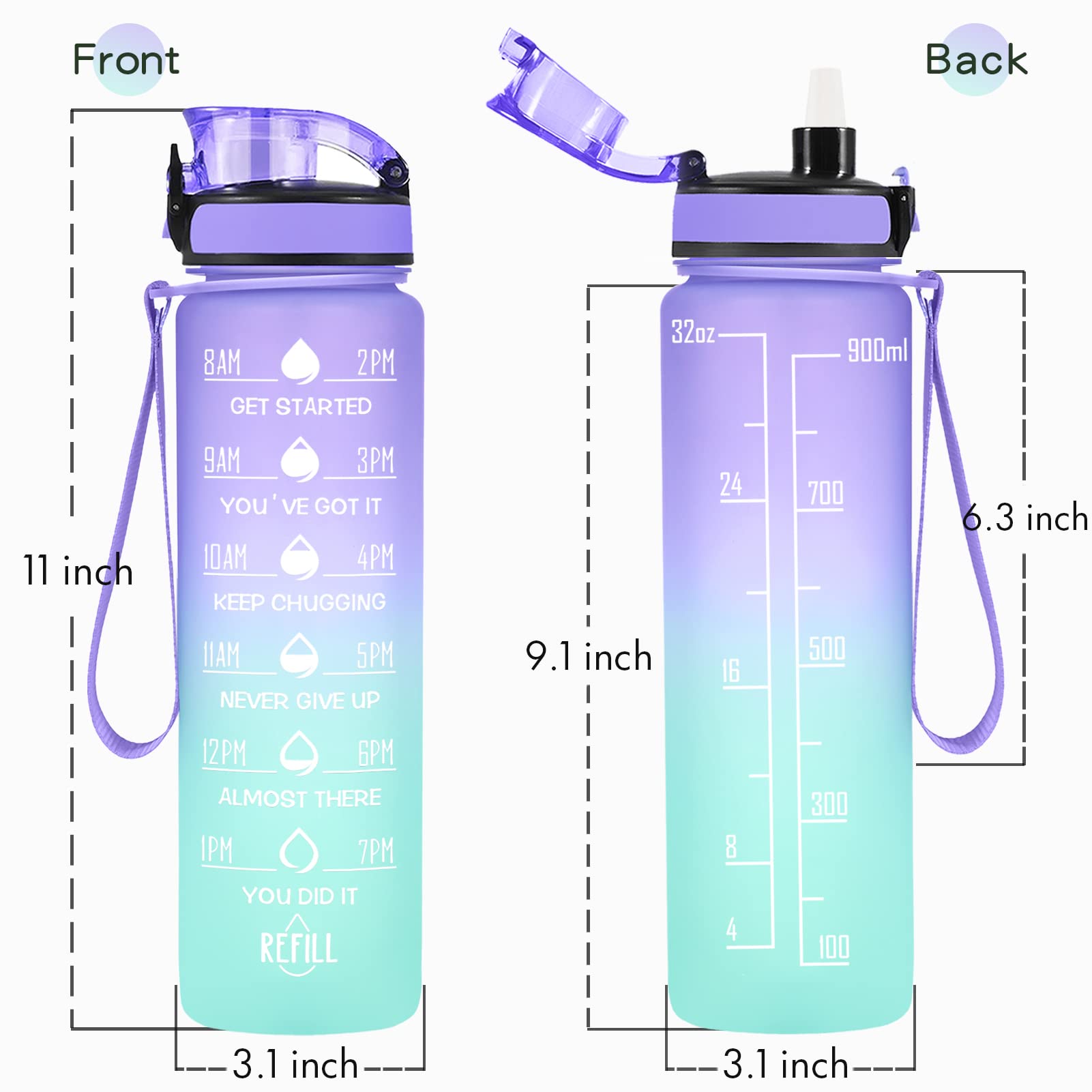 - Stay Hydrated: 32 oz water bottle with motivational quote and time marker to track daily water intake