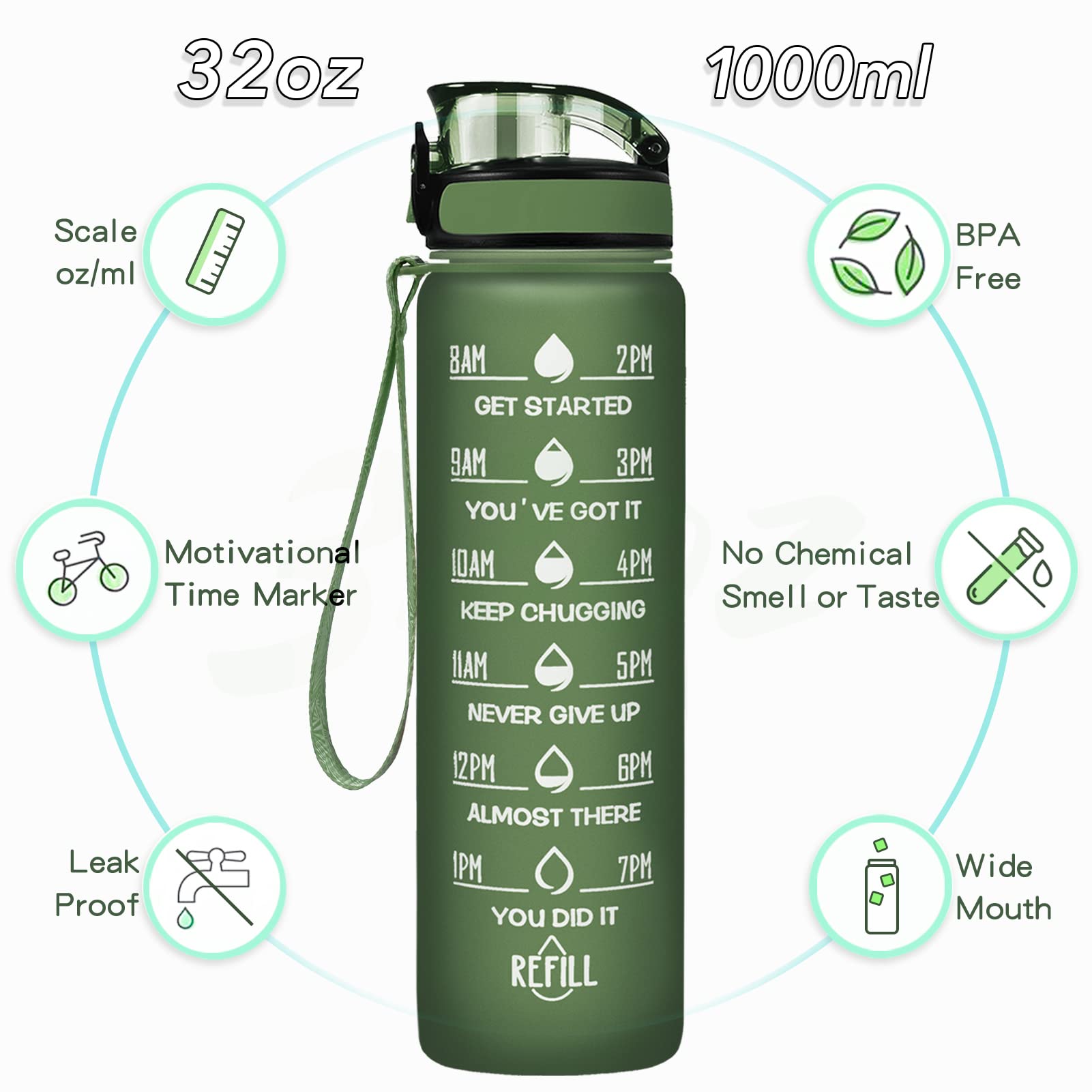 Enerbone 32 oz Water Bottle, Leakproof BPA & Toxic Free, Motivational Water Bottle with Times to Drink and Straw, Fitness Sports Water Bottle with Strap for Office, Gym, Outdoor Sports, Hunter Green