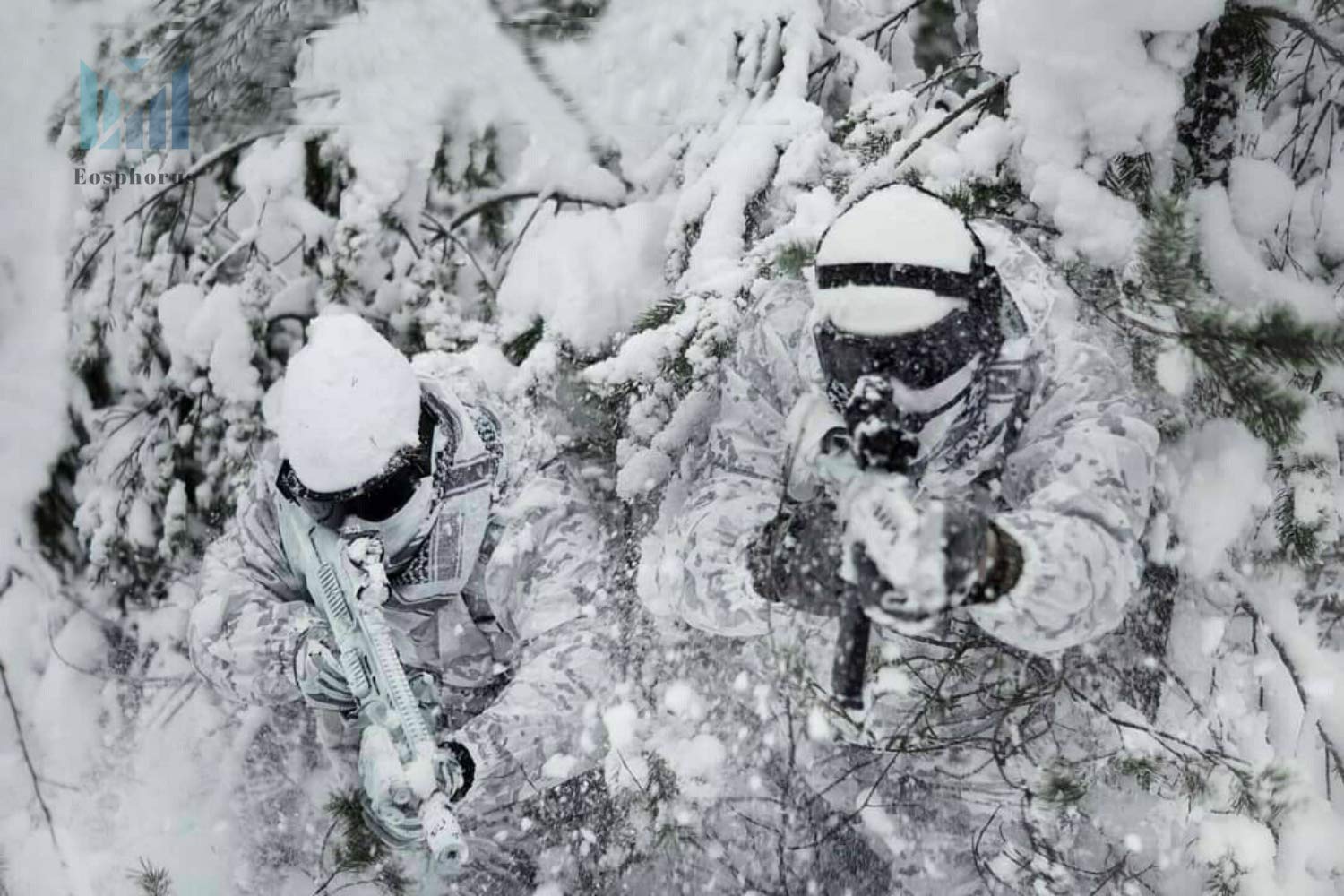 The suit is made of surface-modified polyester fabric, which is water-repellent, lightweight, and durable (as all polyester fabrics). The jacket zipper is made of plastic to avoid rusting. The adopted winter Multicam Alpine pattern is somewhat grayish, while in bright light it is almost white, with the reflections inherent in Multicam. It works fine both in the field and in the forest and effectively reduces the visual and near-IR signature of a person operating in snow-covered environments. The suit is packed in a small draw-stringed pouch. The total weight of the suit with the pouch is only 11 ounces.