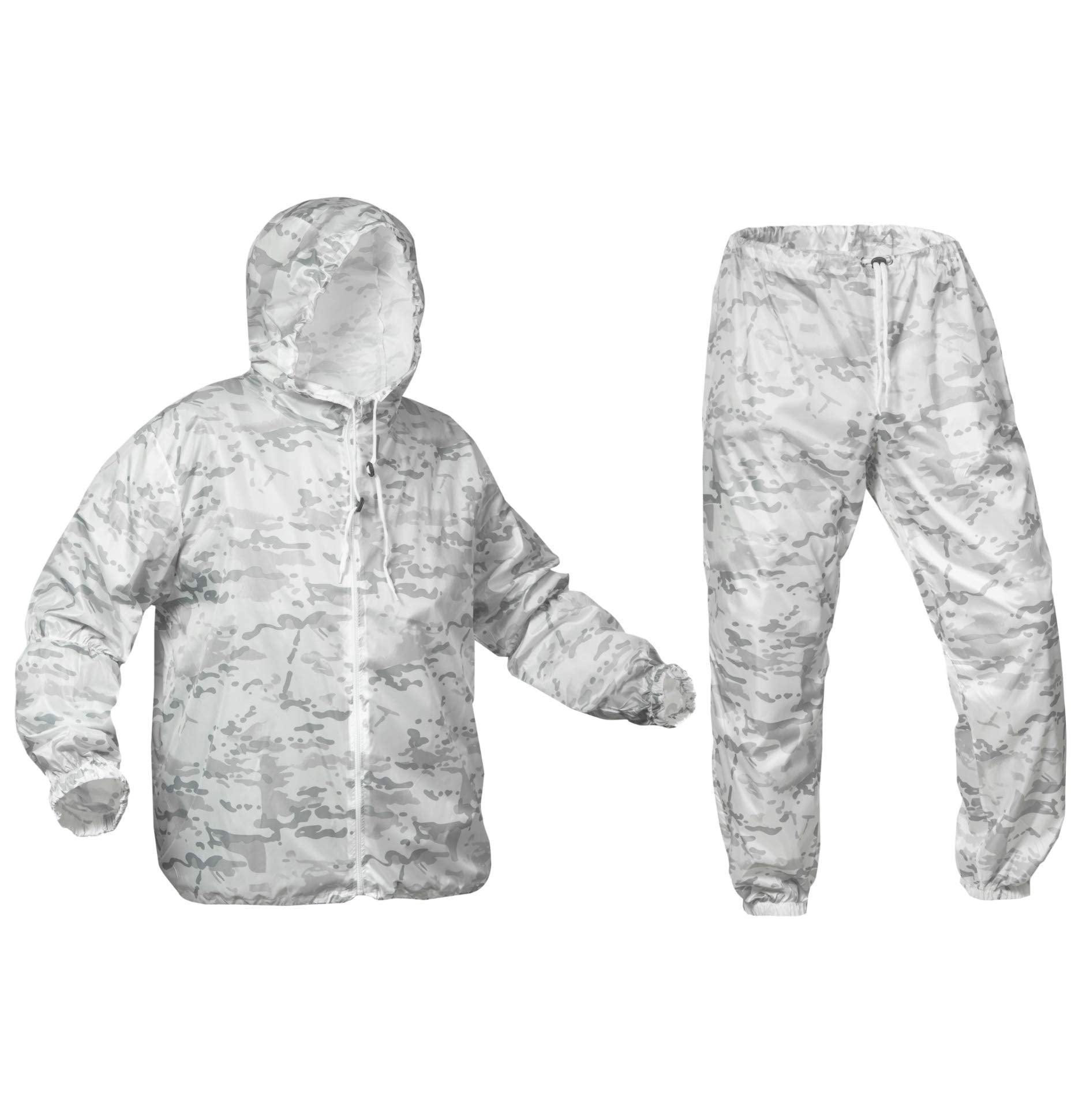Brand new Multicam Alpine Snow Camo Winter Oversized Masking Suit Ultra-Thin Windbreaker consisting of Hooded Jacket, Pants and Backpack Cover (optional). The jacket has a large draw-stringed hood, designed to go over the hat, elastic bands on the elbows for tighter fit, elastic cuffs on the sleeves, a zipper in the front and draw-stringed bottom. The pants have draw-stringed waist, elastic bands in the area of knees for tighter fit and elastic cuffs on the bottom. The outfit is available in free size and intended to be worn over your winter clothes.