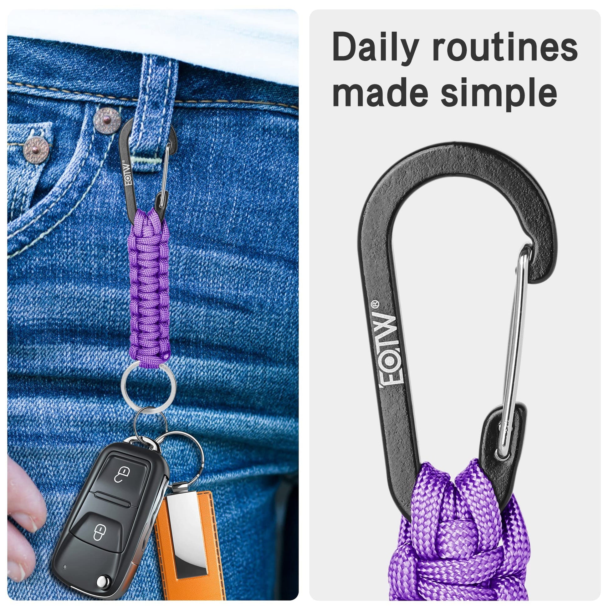 - Multifunctional: These EOTW Paracord Keychain provide variety of potential uses for you. With a sturdy clip hook to hold and store your keys, or attach your keys to your backpack/briefcase or belt loop. Heavy duty designed make it strong enough for small things like flint scrapper, cutting tool,emergency whistle, knife, mini flashlight, Scissors, etc