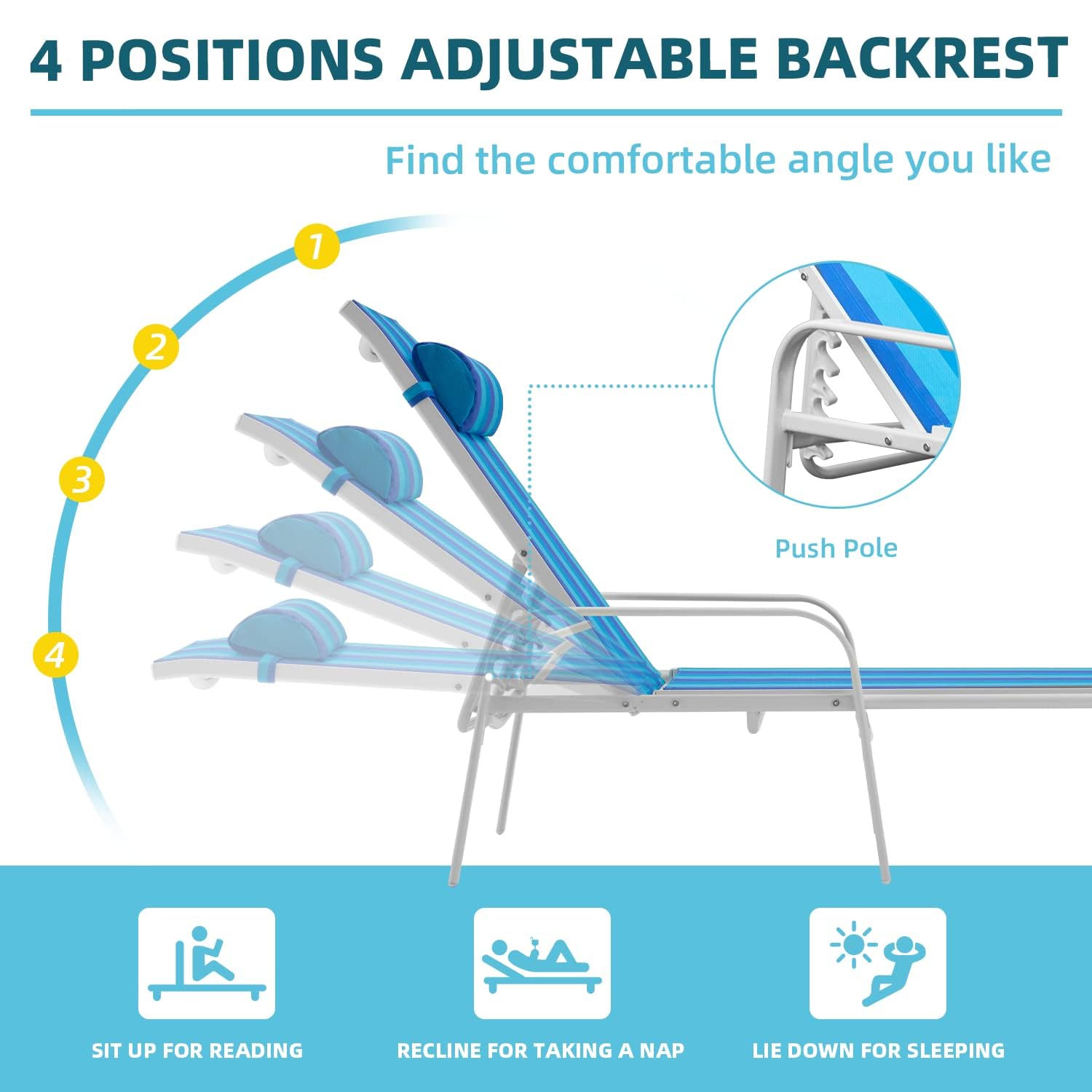 - 4 -Position Adjustment:Our patio chaise lounge chair has 4 different reclining positions for versatility comfort, allowing you to find the optimal angle for reading, napping, sunbathing, or simply enjoying the outdoors.