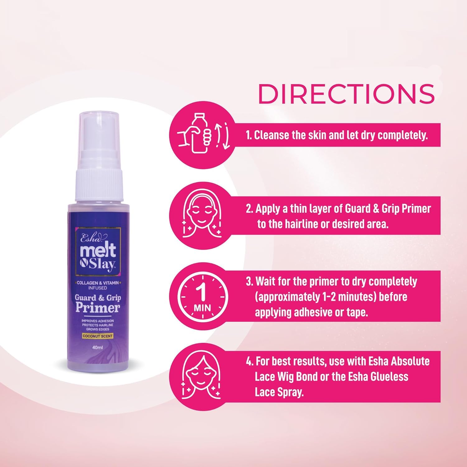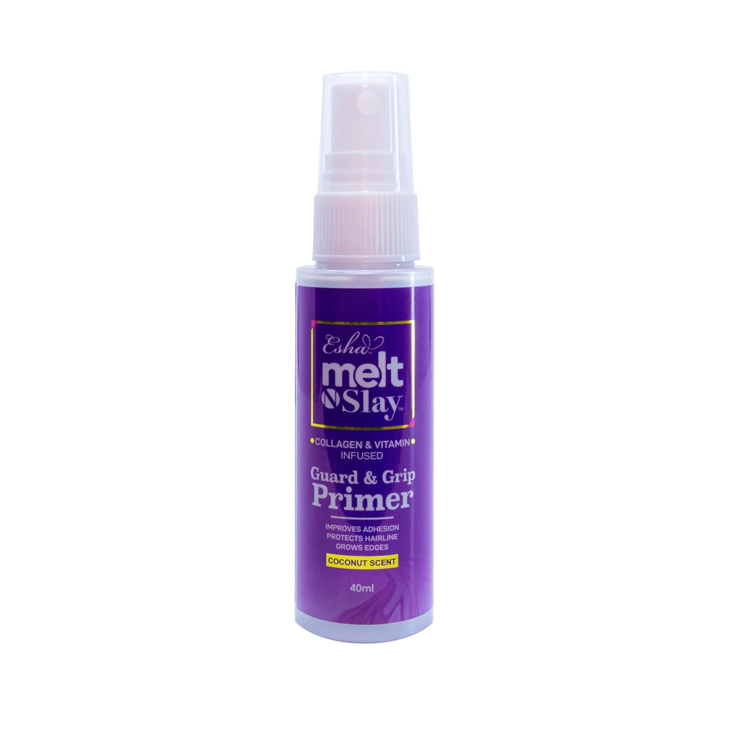 - đșăPROTECT YOUR HAIRLINEăYour natural hairline deserves the best care. The Esha Melt N Slay Guard & Grip Primer creates a protective barrier between your natural hairline and the adhesive, ensuring the integrity of your hair is maintained. Bid farewell to concerns about damage and hello to a beautifully preserved hairline.
