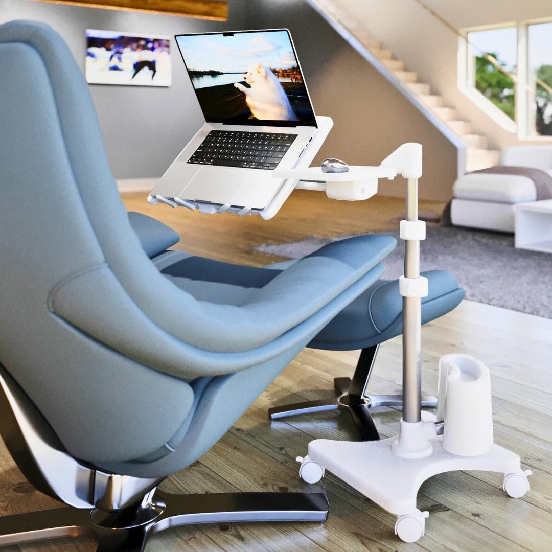 - UNPARALLELED LAPTOP STAND: Introducing a pinnacle of strength and versatility, weighing in at 29 pounds with a counterbalanced base comprising 15 pounds for utmost stability. Its 2-inch wheels facilitate seamless mobility across your home, ensuring effortless relocation. Compatible with various furniture styles, this stand seamlessly integrates into your living space. We recommend reviewing our detailed SPEC sheet in the images for precise measurements.